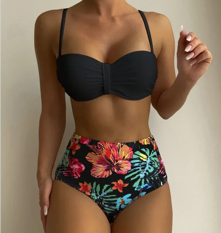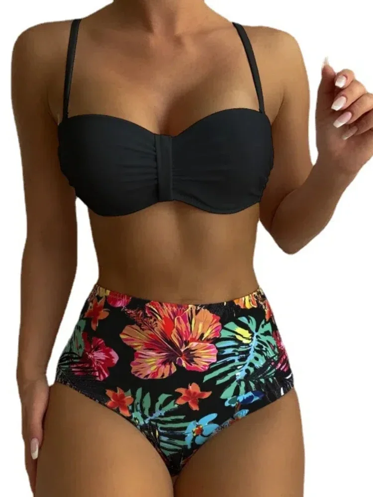 Elegant Solid Swimsuit Women Sexy Slim Pleated High Waist Bikini Split Bathing Suit 2025 New Simple Classic Beachwear Swimwear