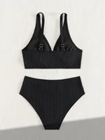 Sexy high waist bikini set 2025 women v neck ribbed push up two piece swimsuit summer bathing suit holiday swimwear biquini