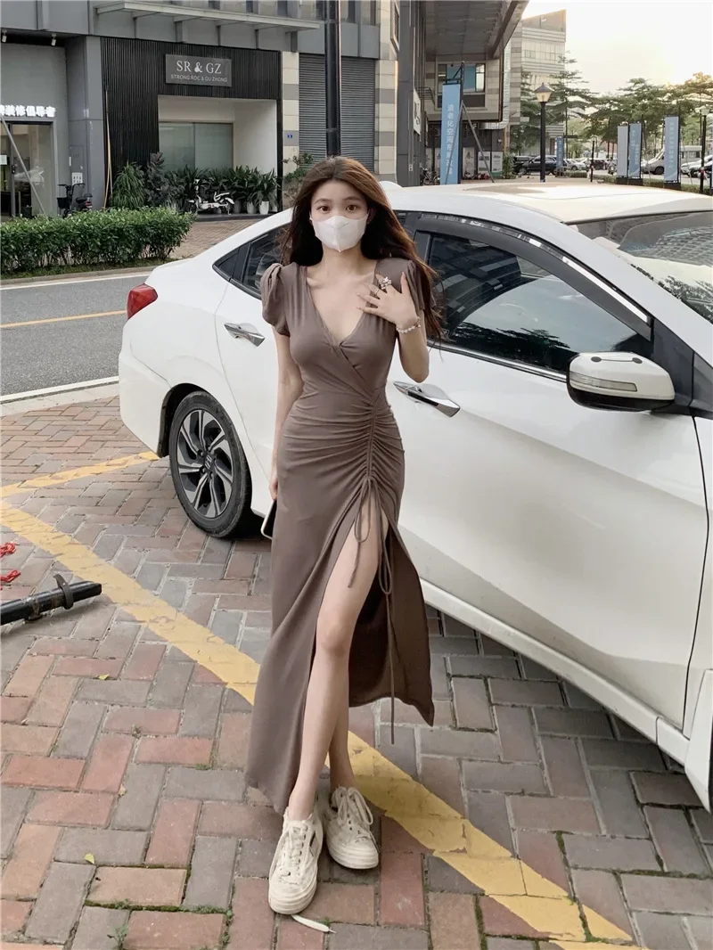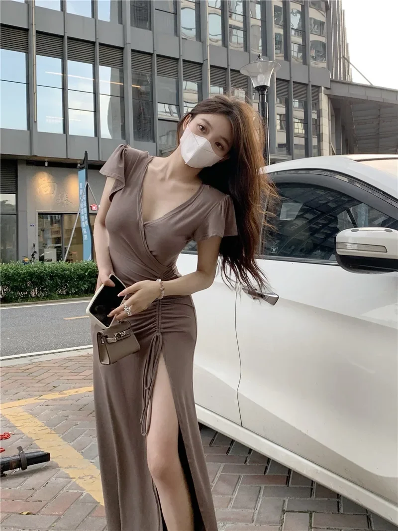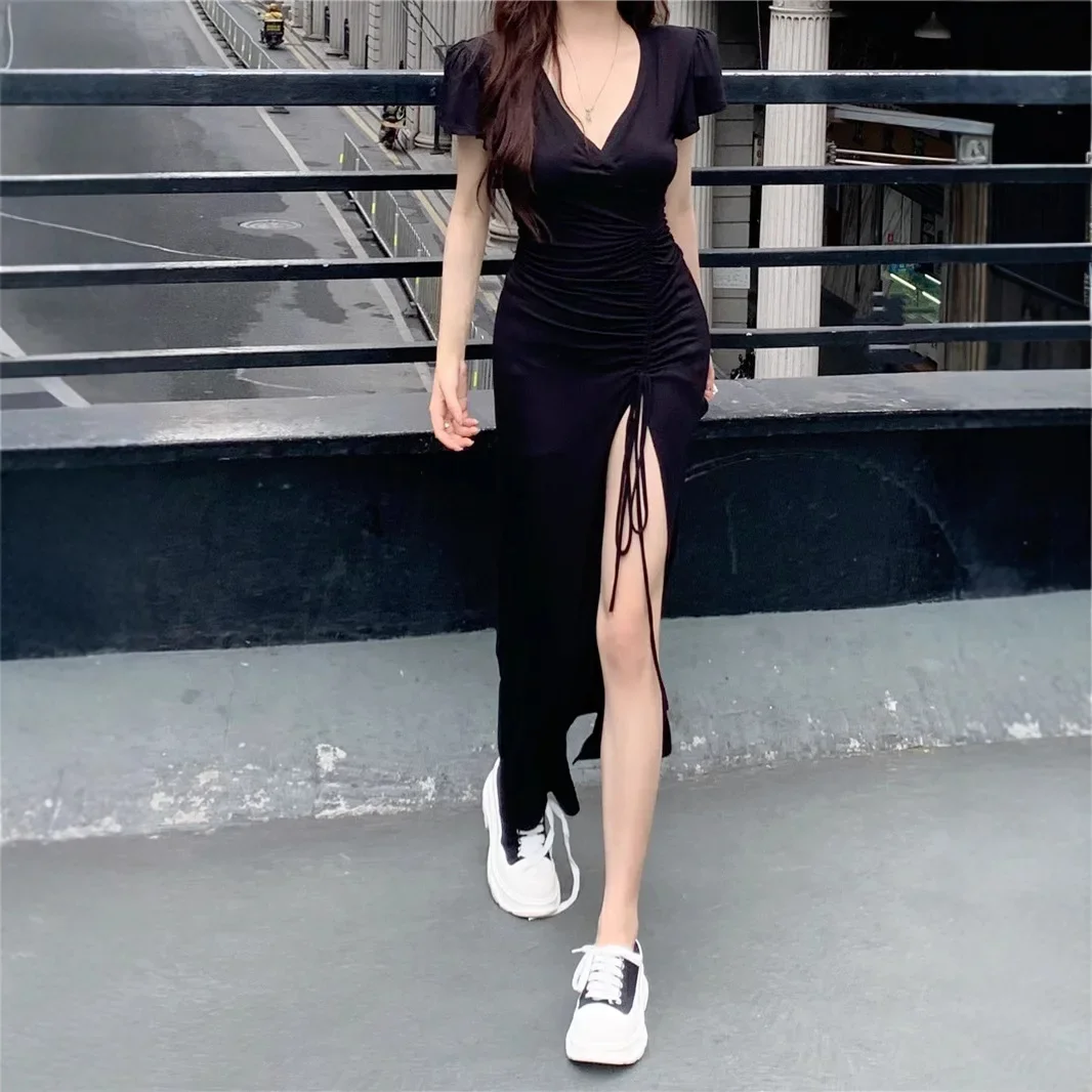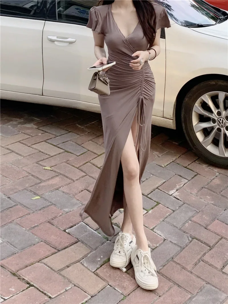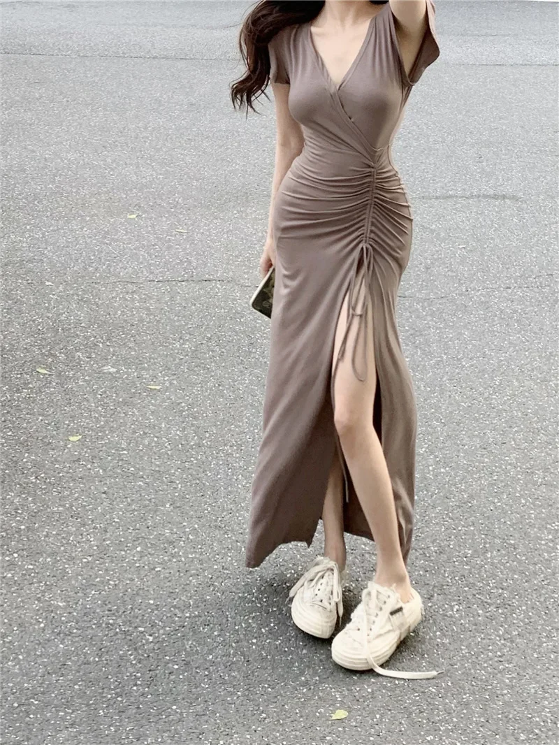 Sexy Long V-neck Dress Women’s Drawstring Slit Skirt Cross-Border Summer New Style Elegant Lady
