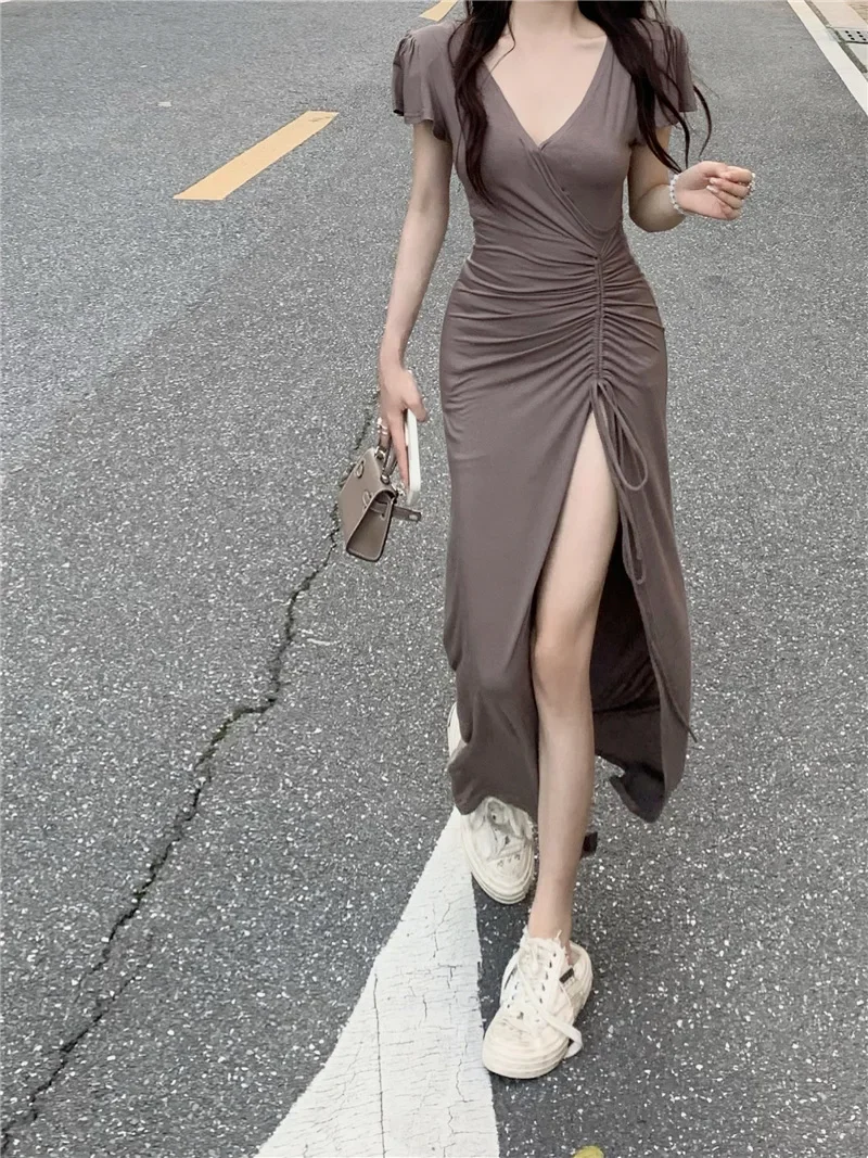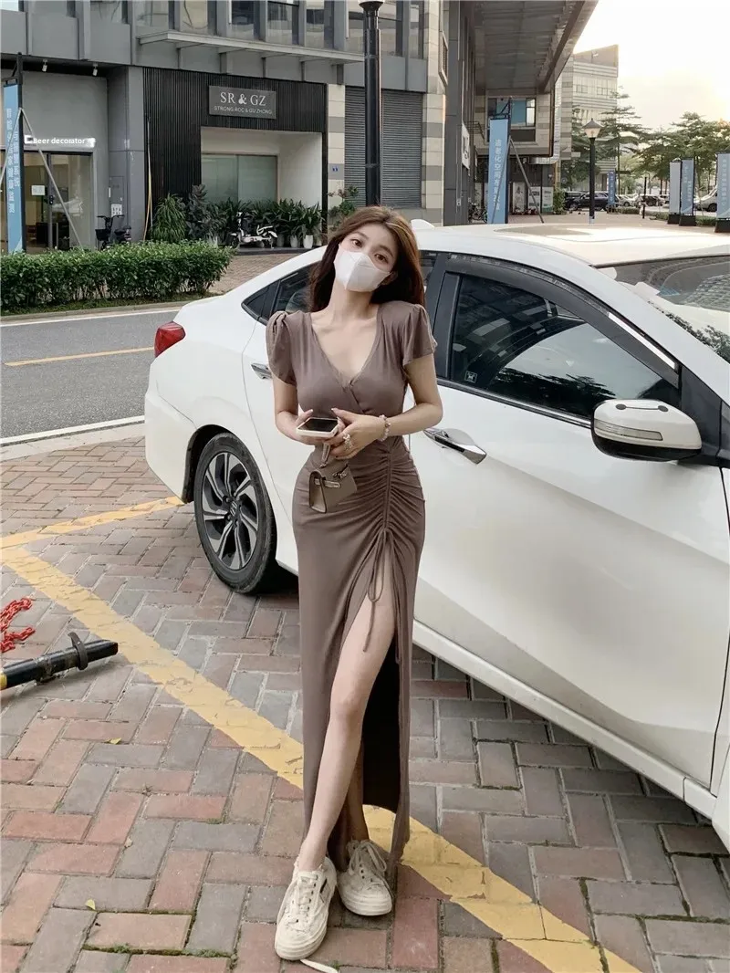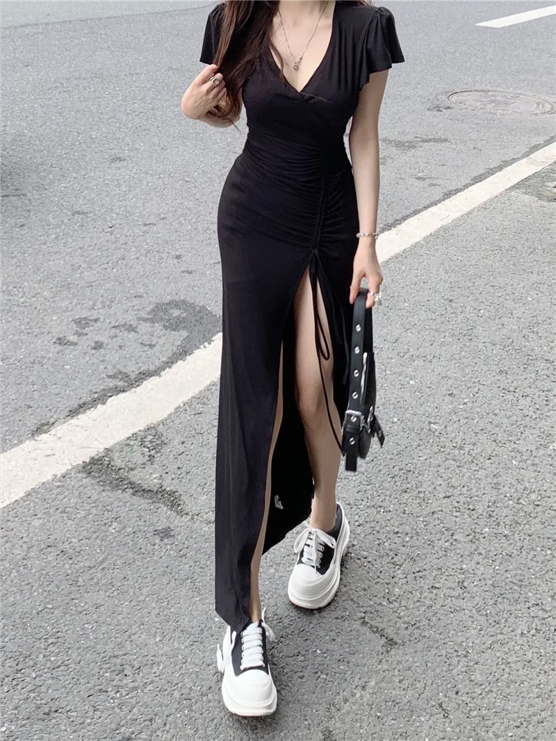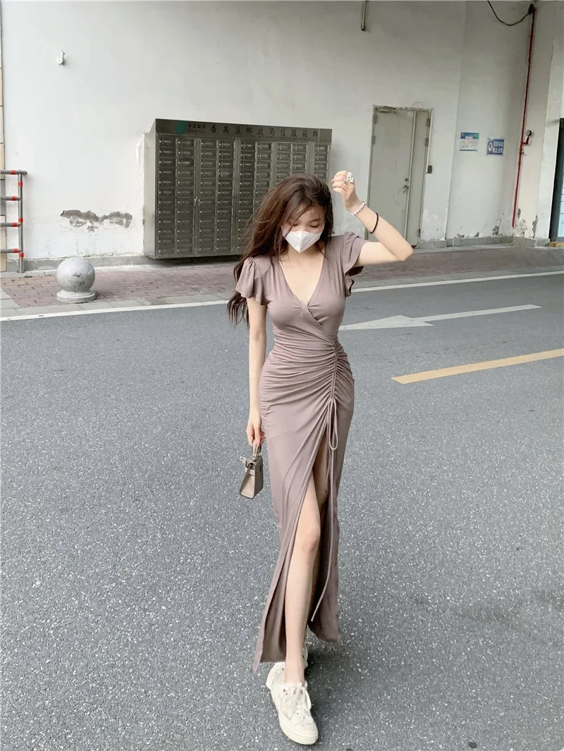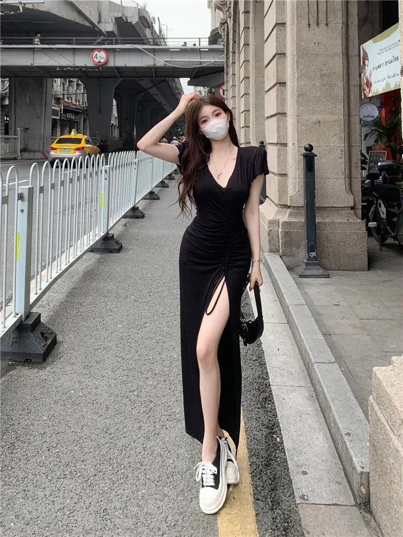 Sexy Long V-neck Dress Women’s Drawstring Slit Skirt Cross-Border Summer New Style Elegant Lady