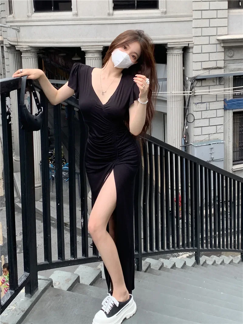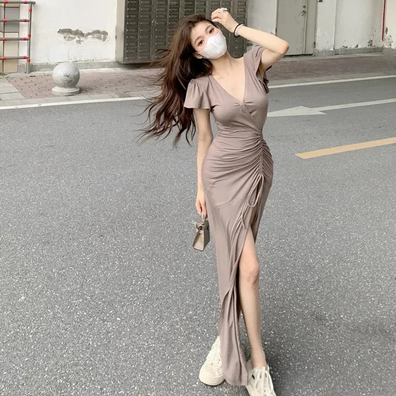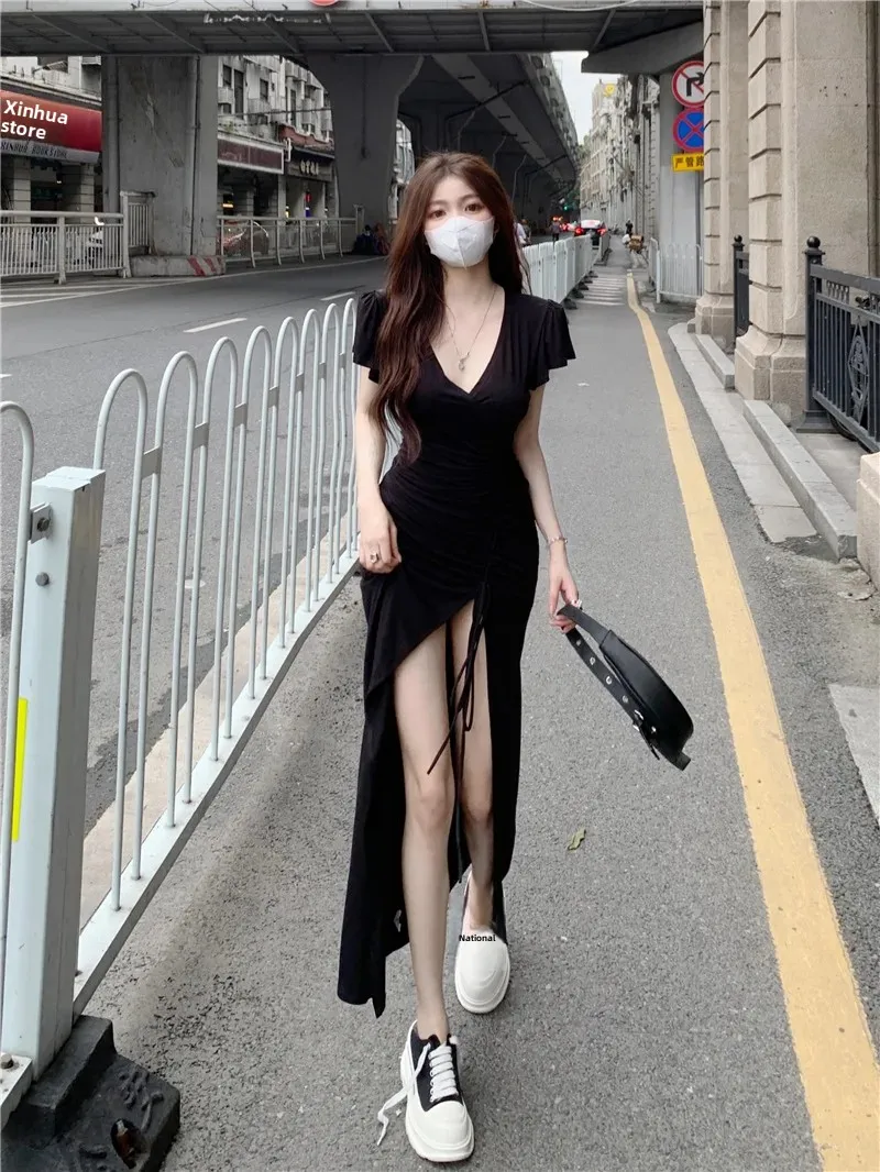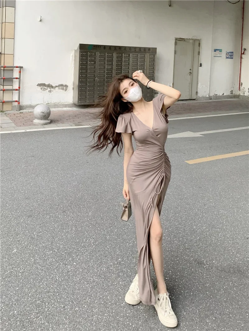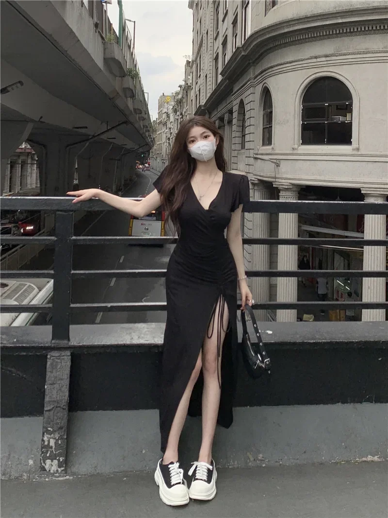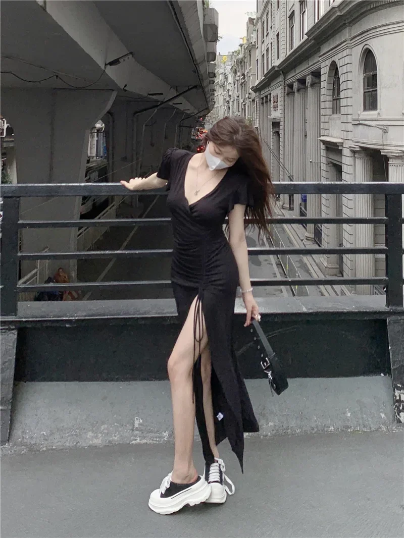 Sexy Long V-neck Dress Women’s Drawstring Slit Skirt Cross-Border Summer New Style Elegant Lady