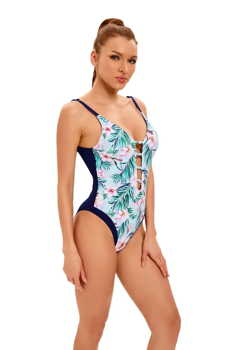 Sexy One Piece Swimsuit Swimwear Women Leaf Floral Print V-neck Holow Bathing Suit Beachwear Trajes