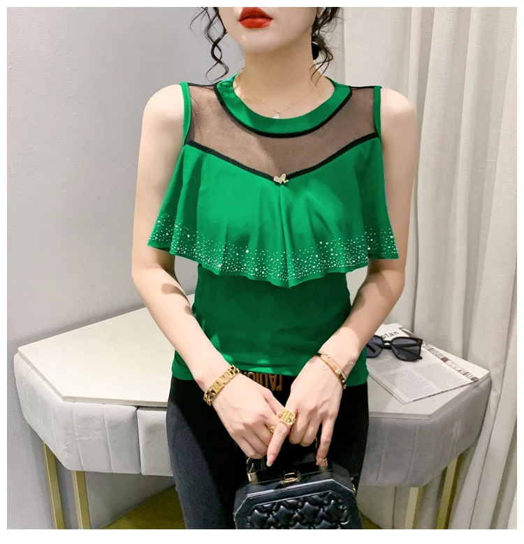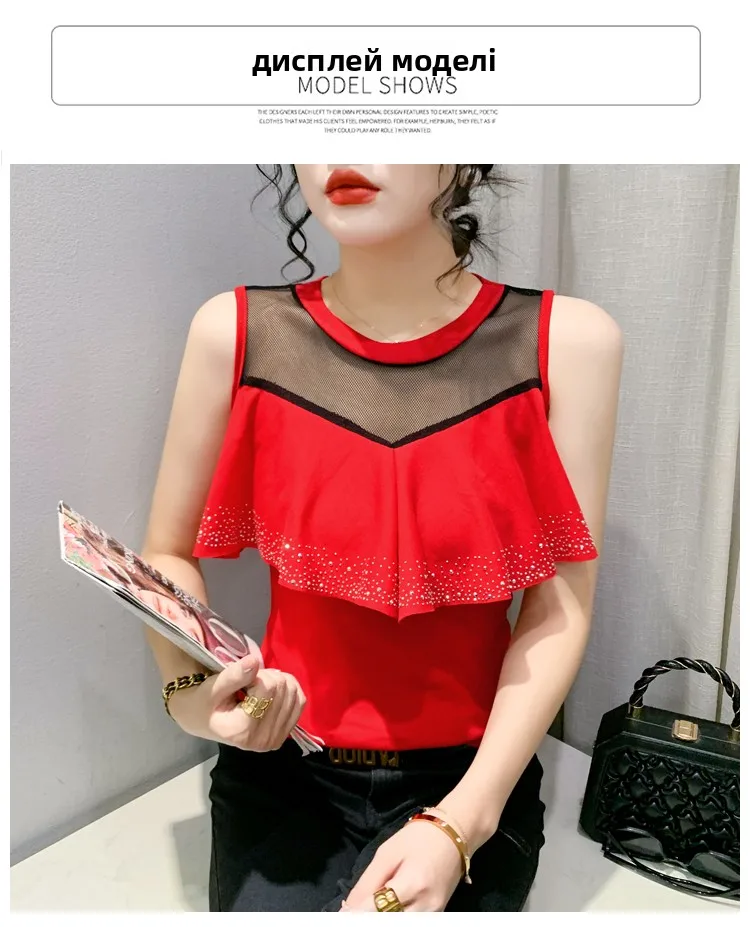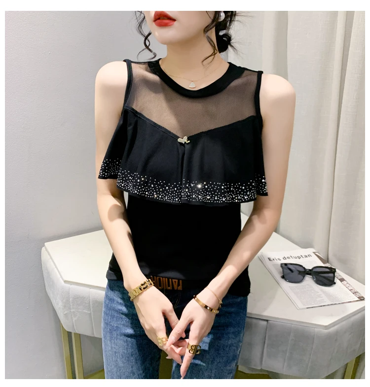 The ruffle trim decoration enhances the feminine charm of the T-shirt, giving it a delicate and elegant touch.