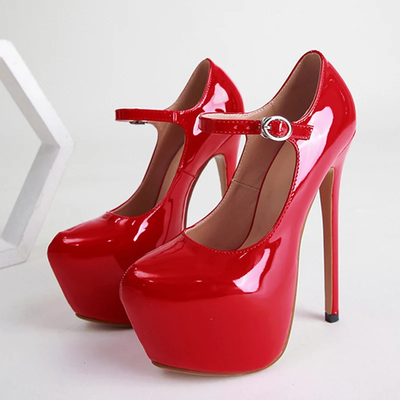 Sexy Red High Heels Platform Pumps 17cm Women Fashion Runway Patent Leather Round Toe Buckle Strap Party