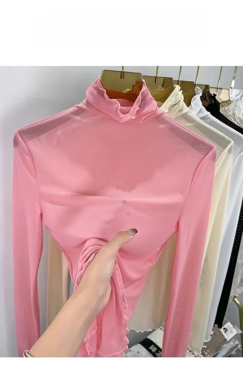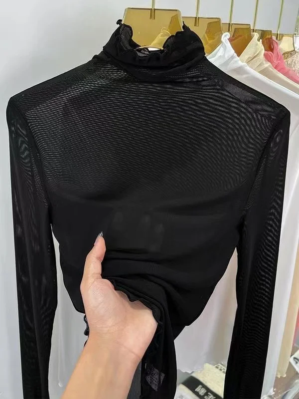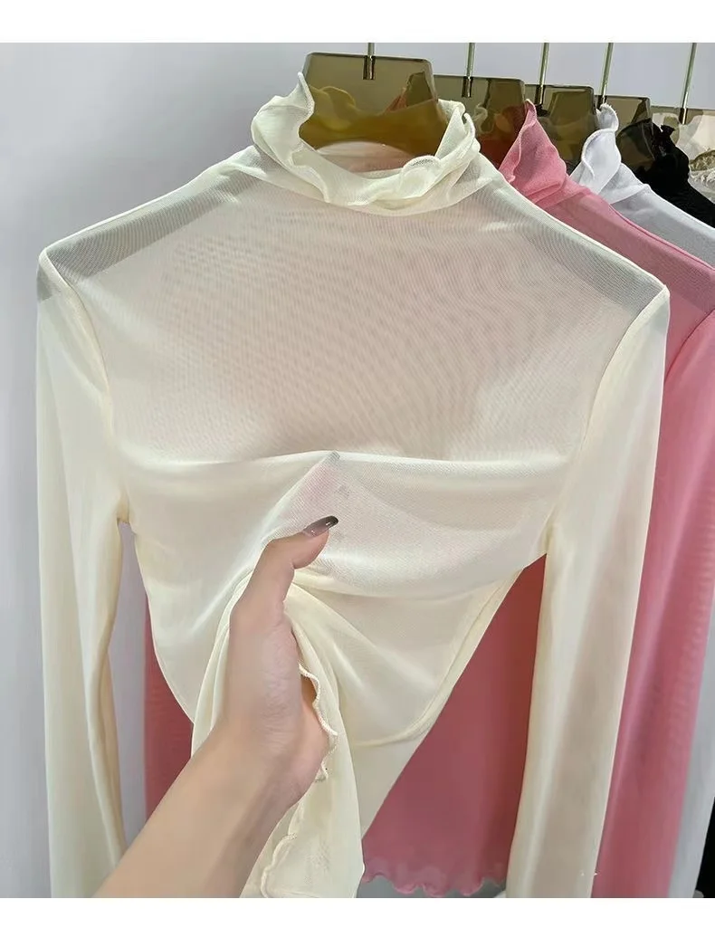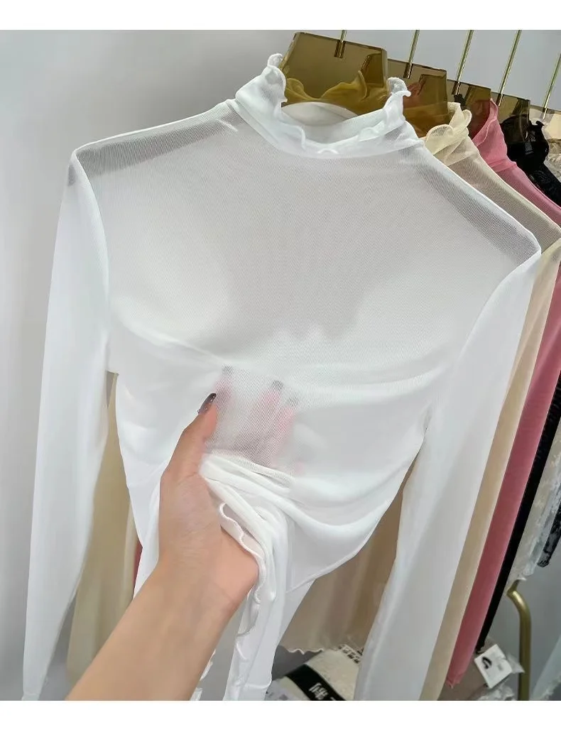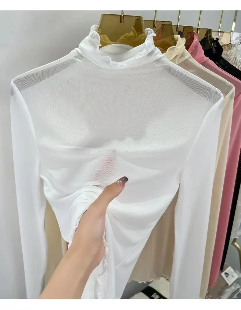 Sexy Semi-Transparent Lace Base irt Women's Thin High Collar Autumn Spring Slim Fit Me Underwear Top Korean Sle T-irt