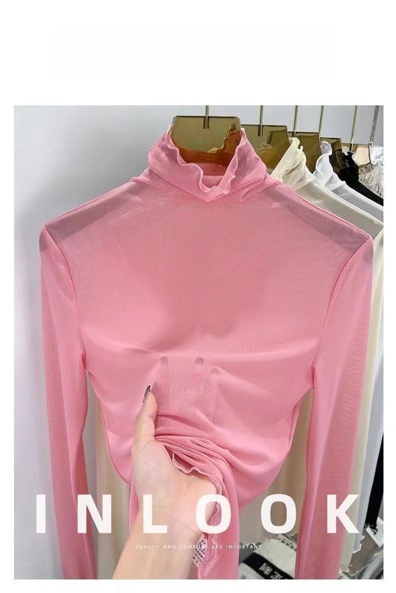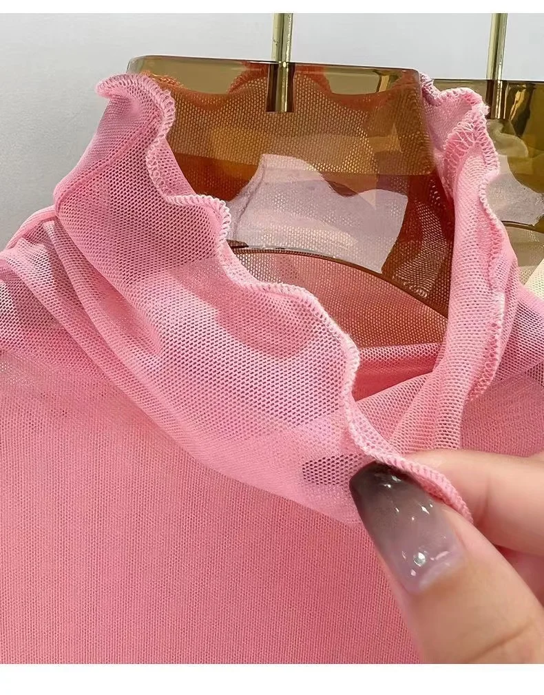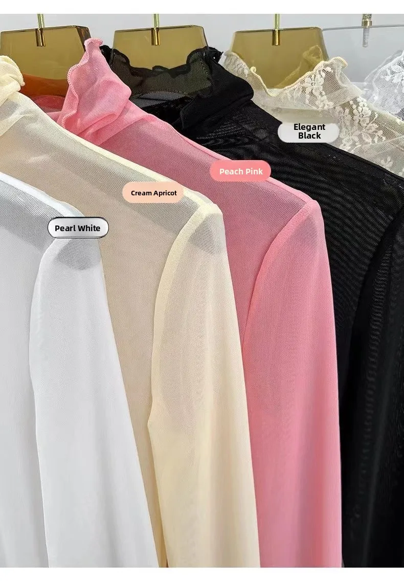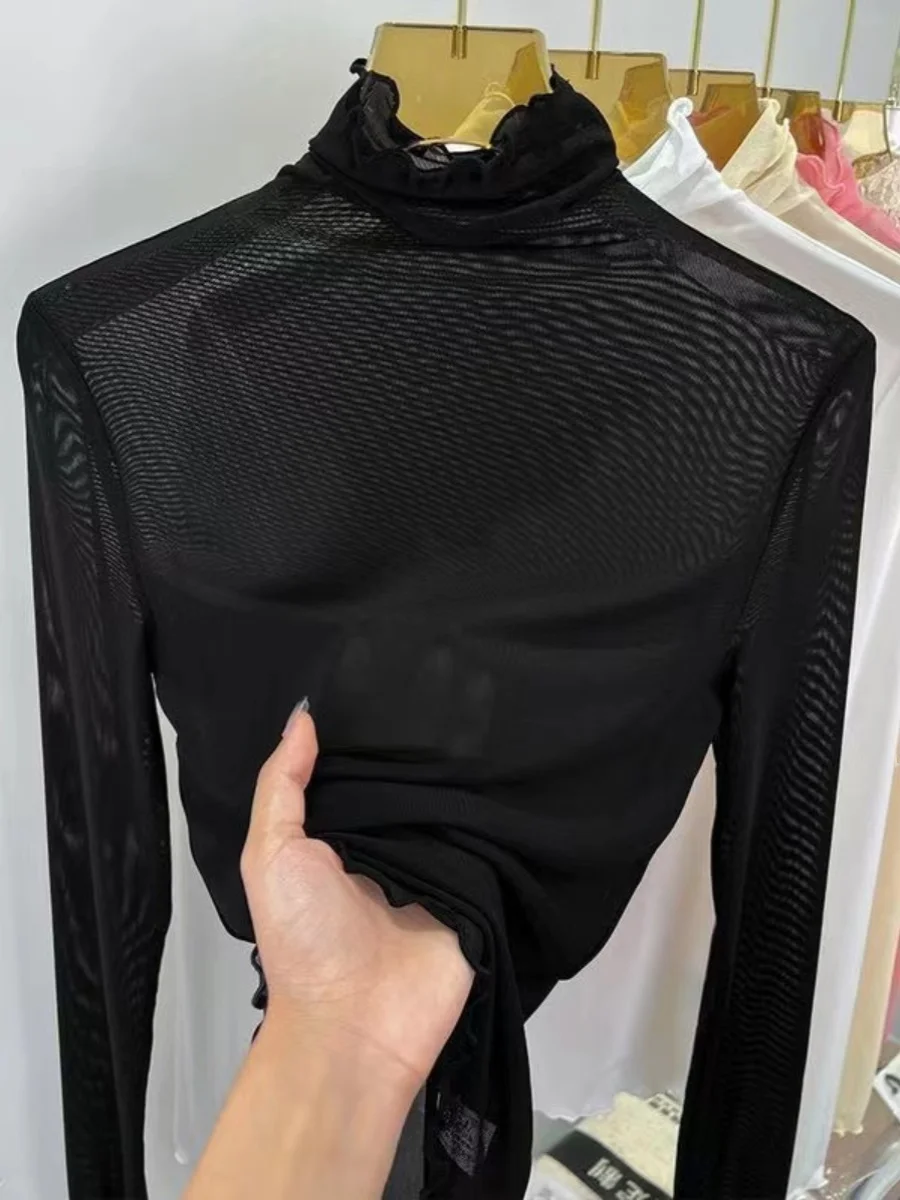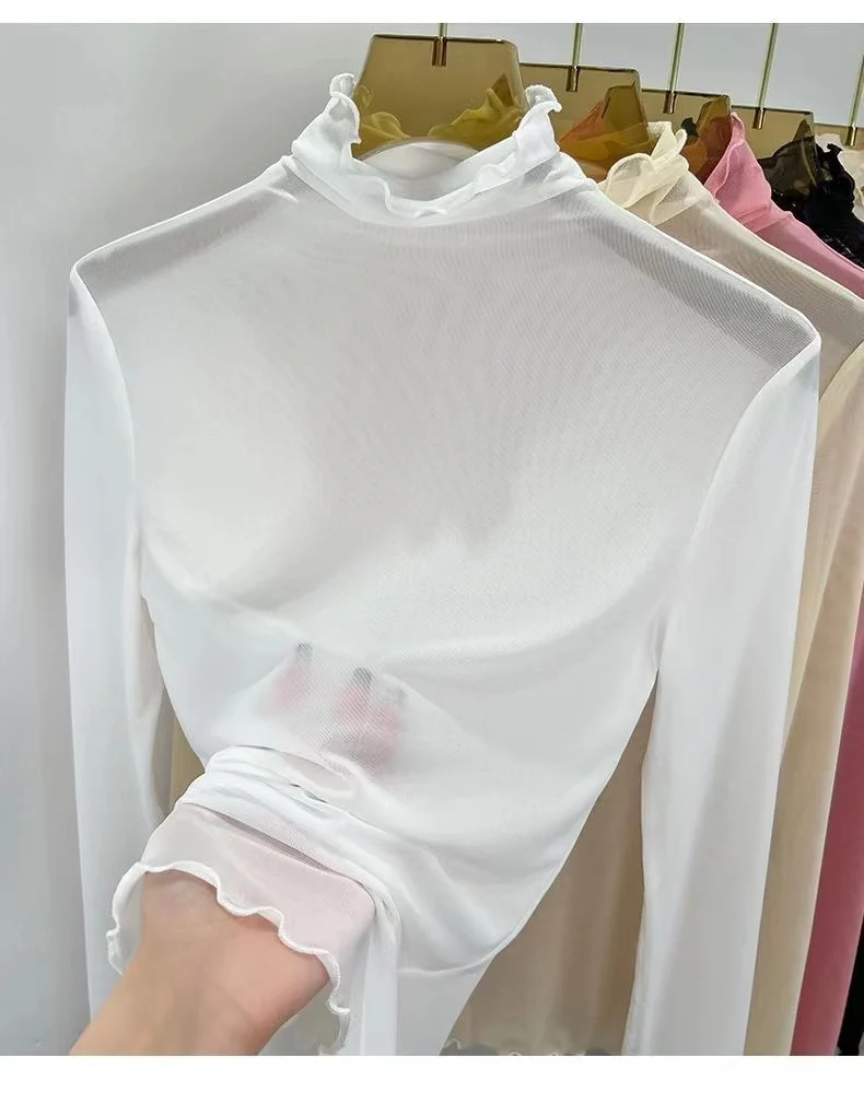 Sexy Semi-Transparent Lace Base irt Women's Thin High Collar Autumn Spring Slim Fit Me Underwear Top Korean Sle T-irt