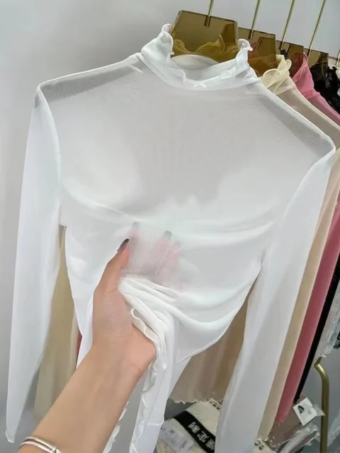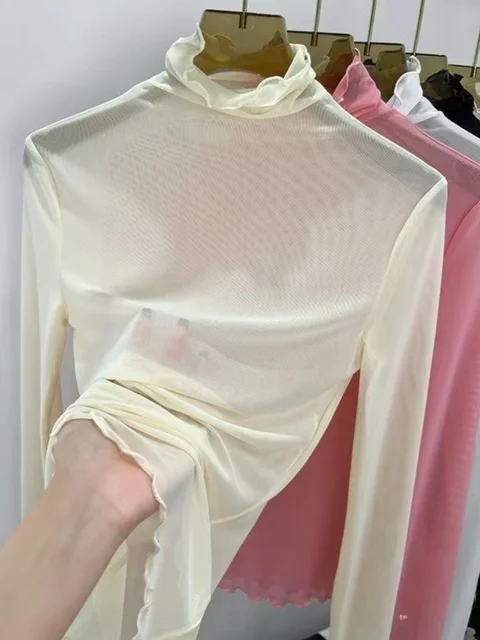Sexy Semi-Transparent Lace Base irt Women's Thin High Collar Autumn Spring Slim Fit Me Underwear Top Korean Sle T-irt