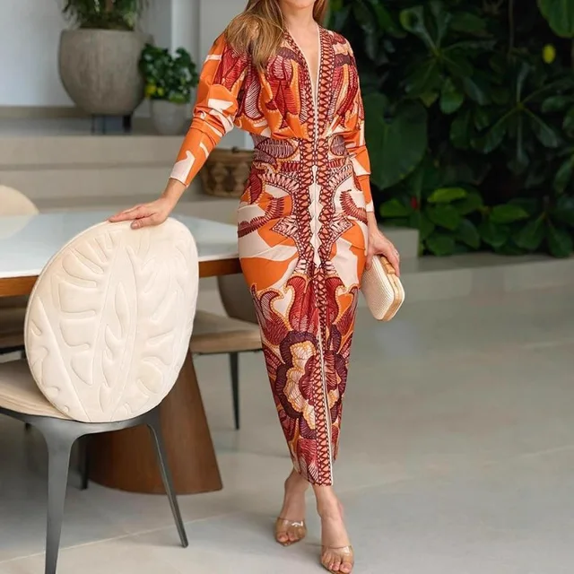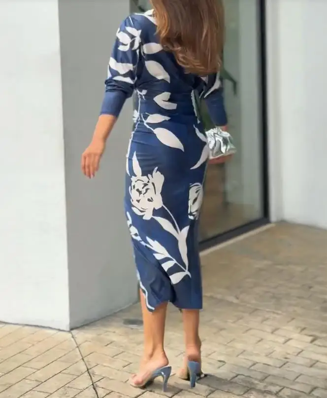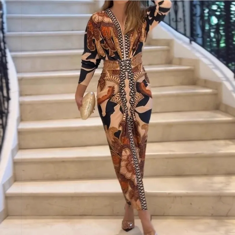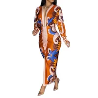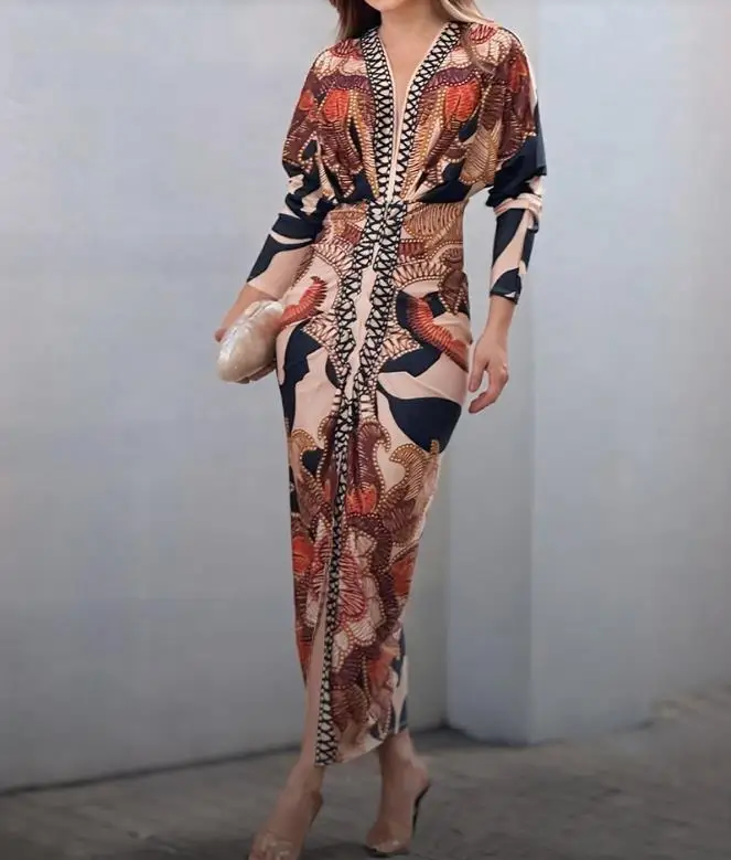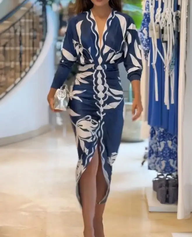 Sexy V-neck Long Sleeve Printed Dress High Waist Split Polyester Women’s Fashion Elegant Commute