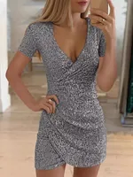 Sexy V-neck Package Hip Irregular Dress For Women Fashion Sequin Shiny Short-sleeve Mini Dress Elegant