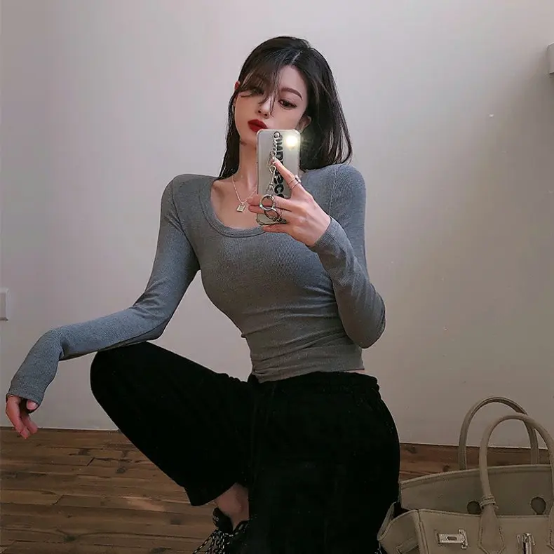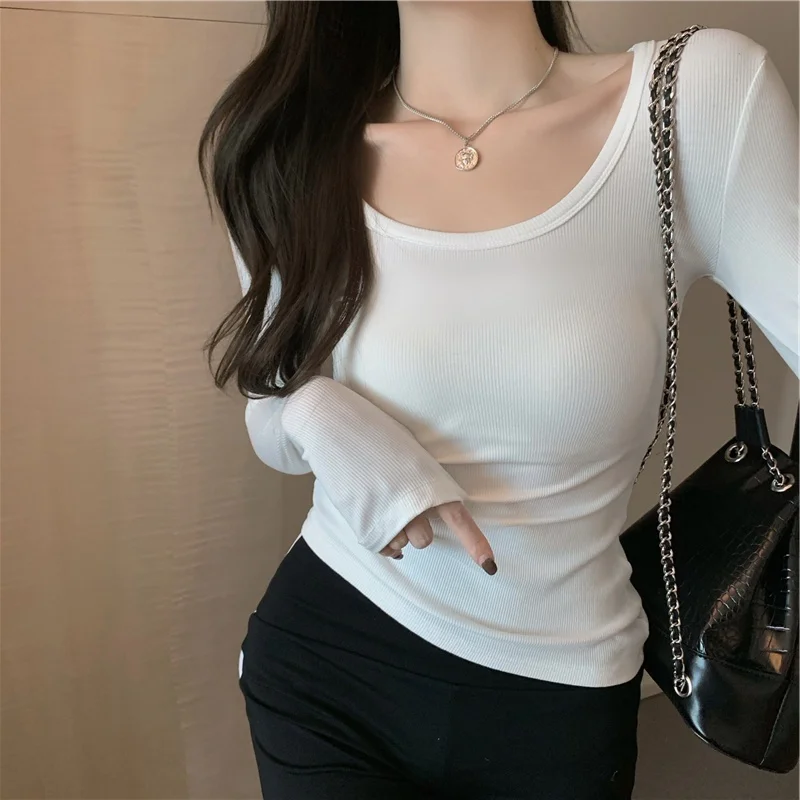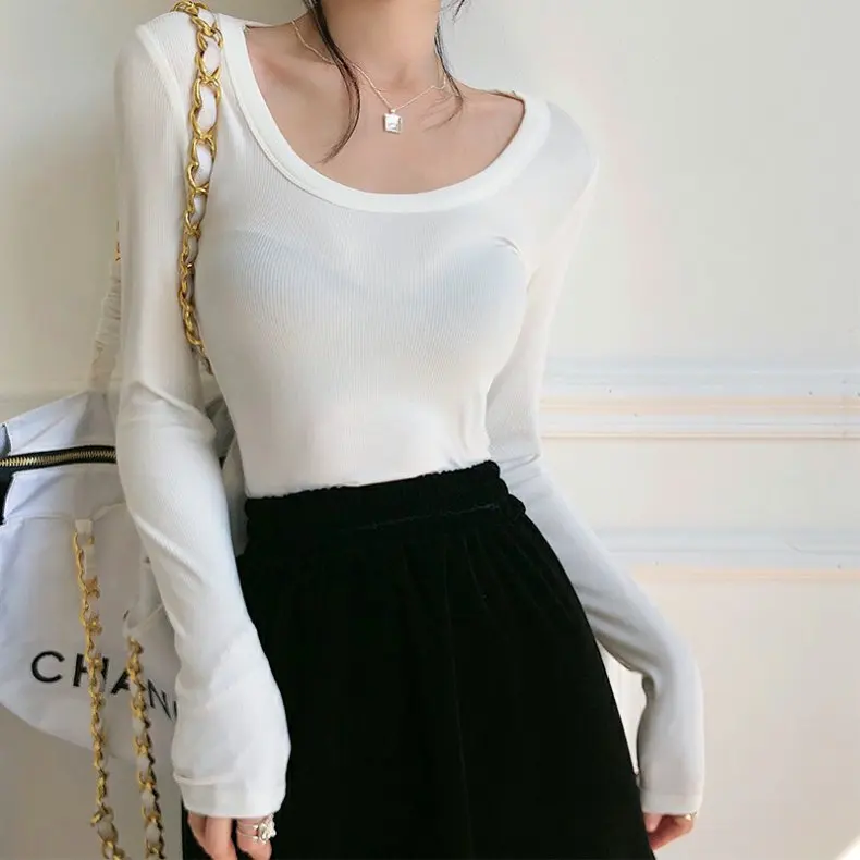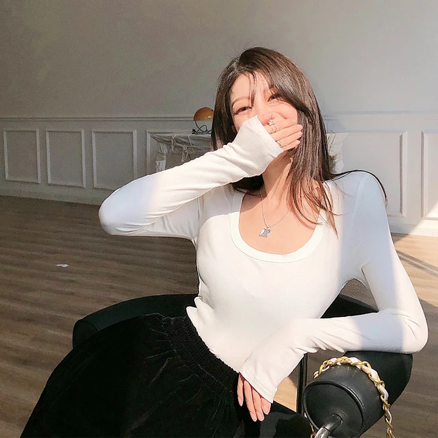 Sexy White round Ne Base irt Women's Spring Autumn Tight Fit Long Sve Low Collar T-irt Commute Sle Korean Version