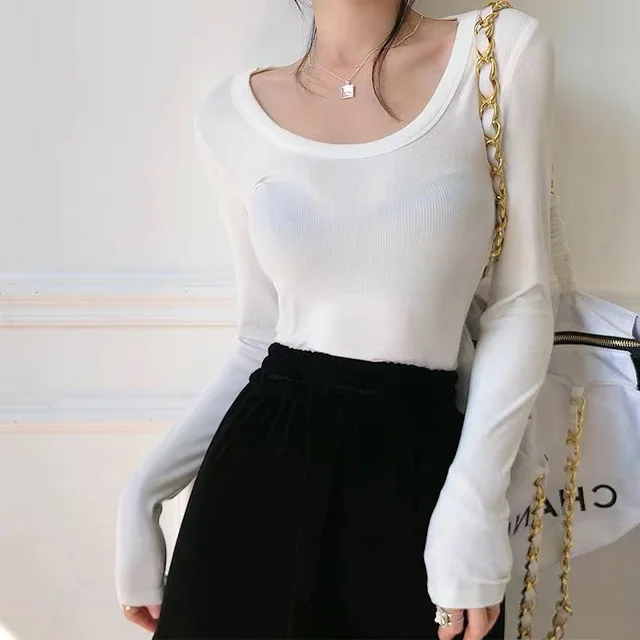 Sexy White round Ne Base irt Women’s Spring Autumn Tight Fit Long Sve Low Collar T-irt Commute