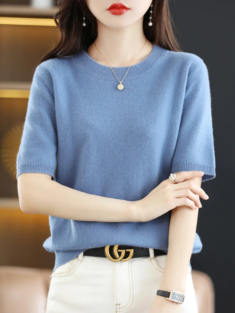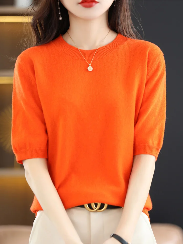 Short Sleeves Women’s Sweater O-neck Bottoming Shirts Solid Spring Summer Korean Fashion Sweater