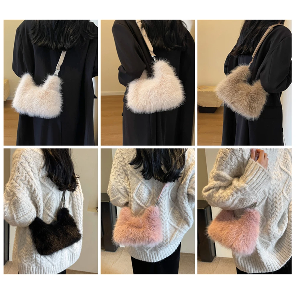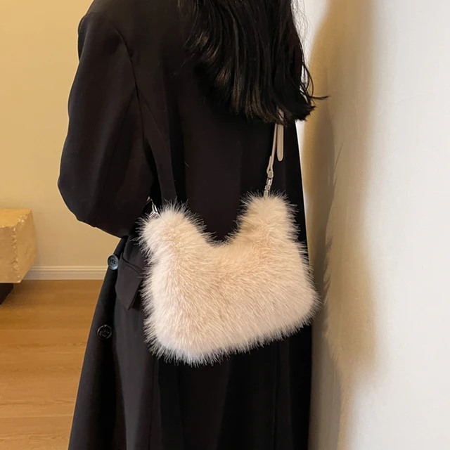 Women Faux Fur Shoulder Bag Soft Plush Fluffy Crossbody Bag Adjustable Strap Clutch Purse Solid Color Hobo Bag for Travel Party
