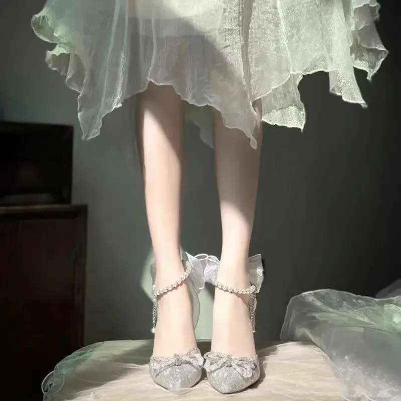 Silver High Heels Women's Thin Heel Two-Way Wedding Dress Evening Gown Shoes Hollow Crystal Bridal Shoes for Maids And Brides