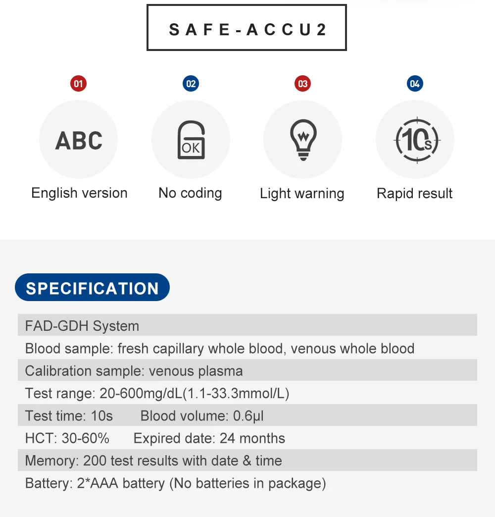 1 x Safe-Accu2 Glucometer device mg/dL (Battery is not included)