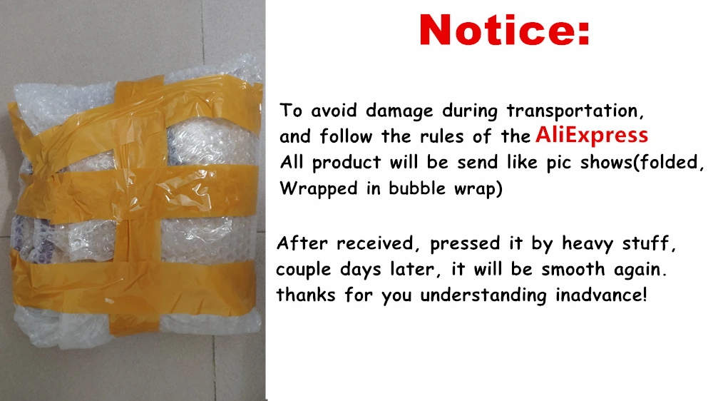 All our products are folded and packaged for shipping according to international package size requirements. In the long-term transportation process, some folds will inevitably appear. But this does not affect the use, and will gradually return to flatness during use.