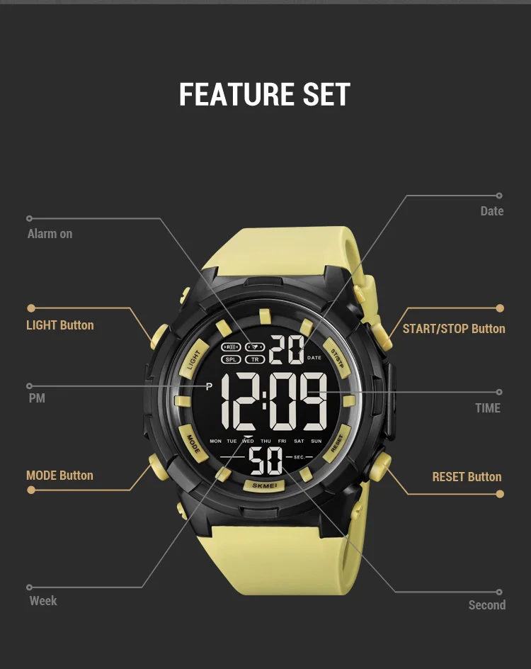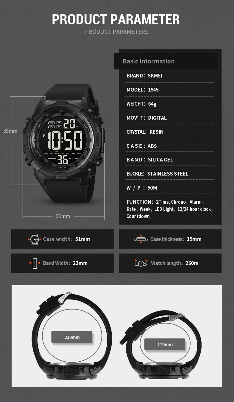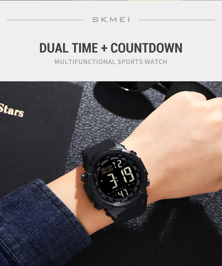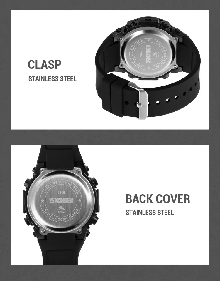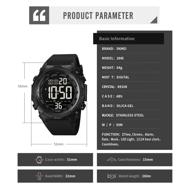 Functions: 5bar Water Resistant,Chronograph,Alarm,12/24 Hour,Dual Time,Date,Month,Countdown
