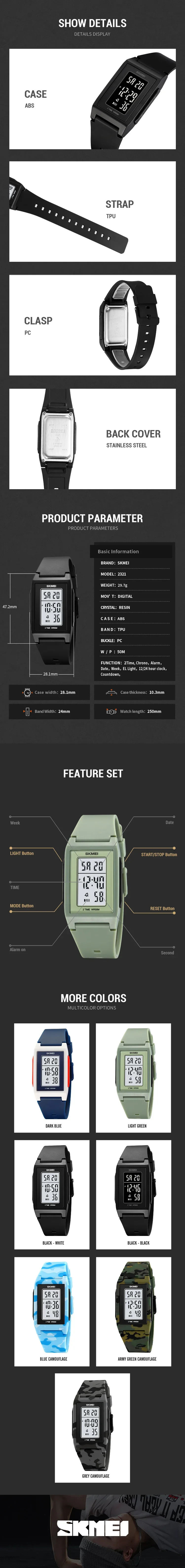 SKMEI 2321 Luxury Sports Waterproof Electronic Mens Wristwatches Digital Watch for Men Military Chrono Alarm 1960 Reloj Hombre