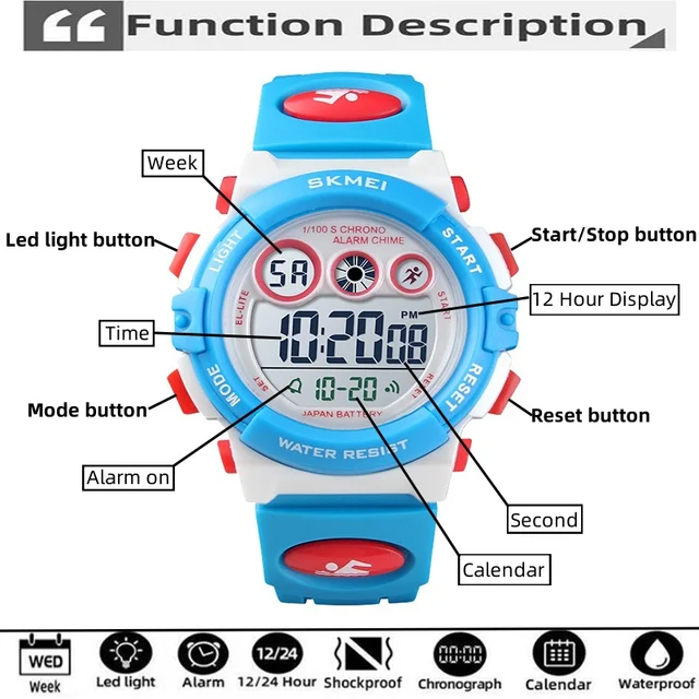 Features : chronograph, stopwatch,week, backlight, waterproof, alarm,EL,12/24 hour clock