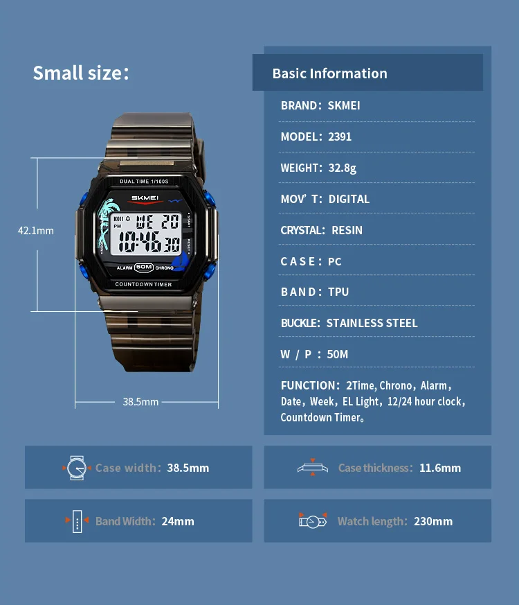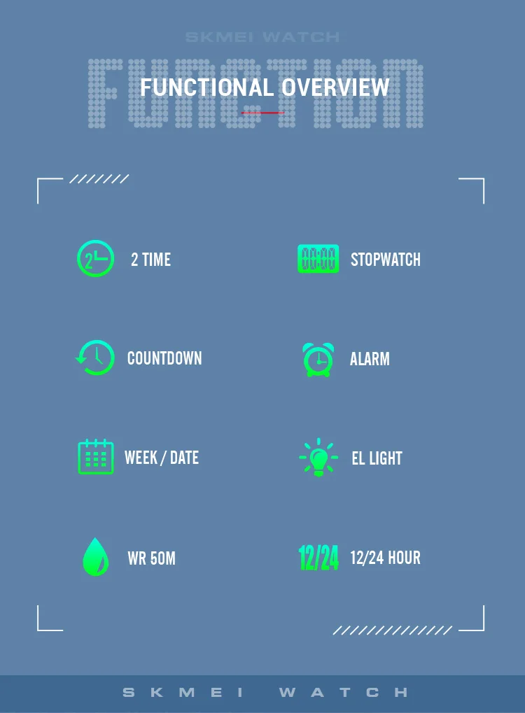 8.Function:2Time, Chrono, Alarm,Date, Week, EL Light,12/24 hour clock,Count down timer.