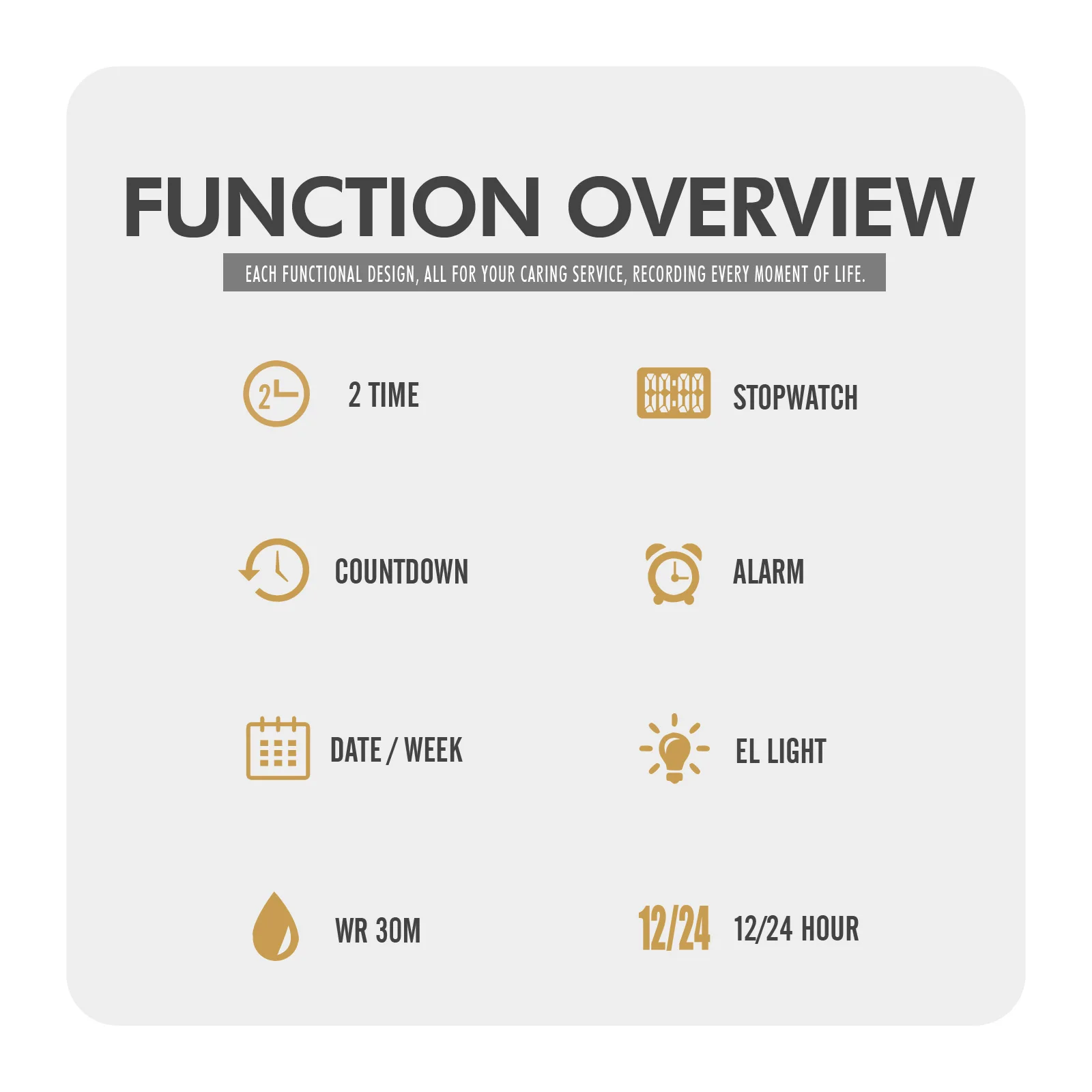 Function: 2-time, stopwatch timer, date, timer alarm, week, EL night light, hourly clock, 12/24-hour clock, countdown.
