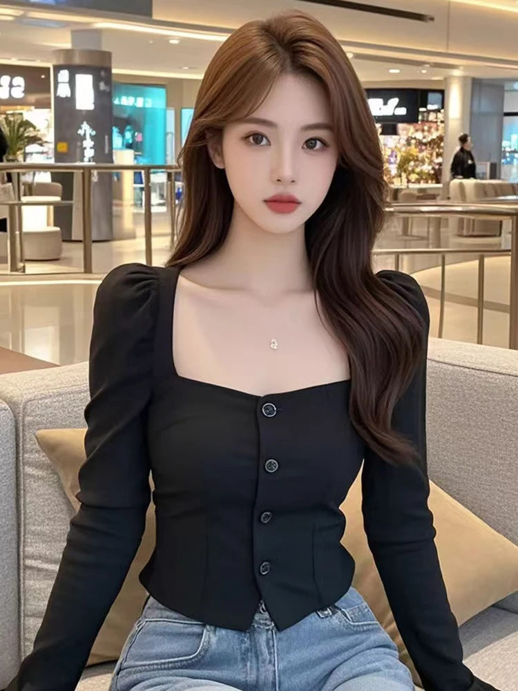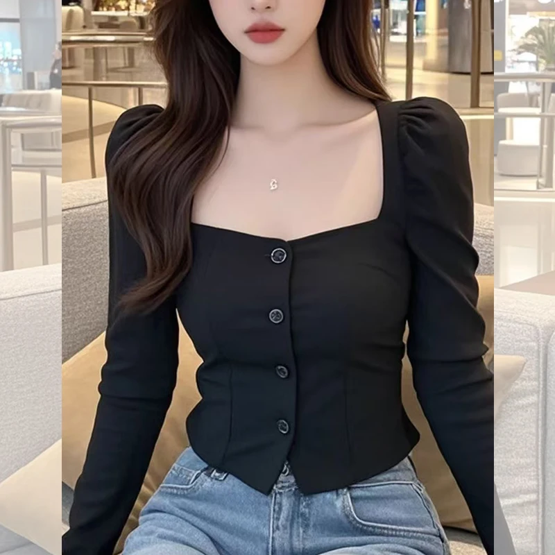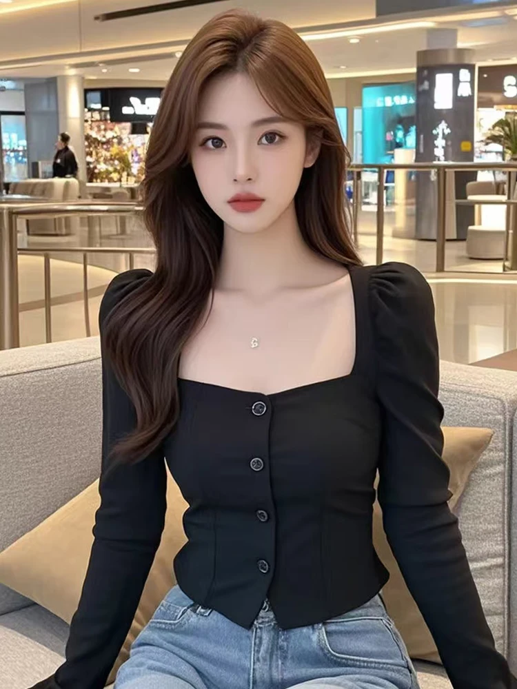 This black square-neck long-sleeve shirt features a sleek and stylish design, perfect for the modern woman who wants to look chic and sophisticated.