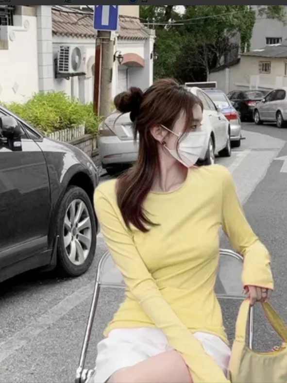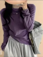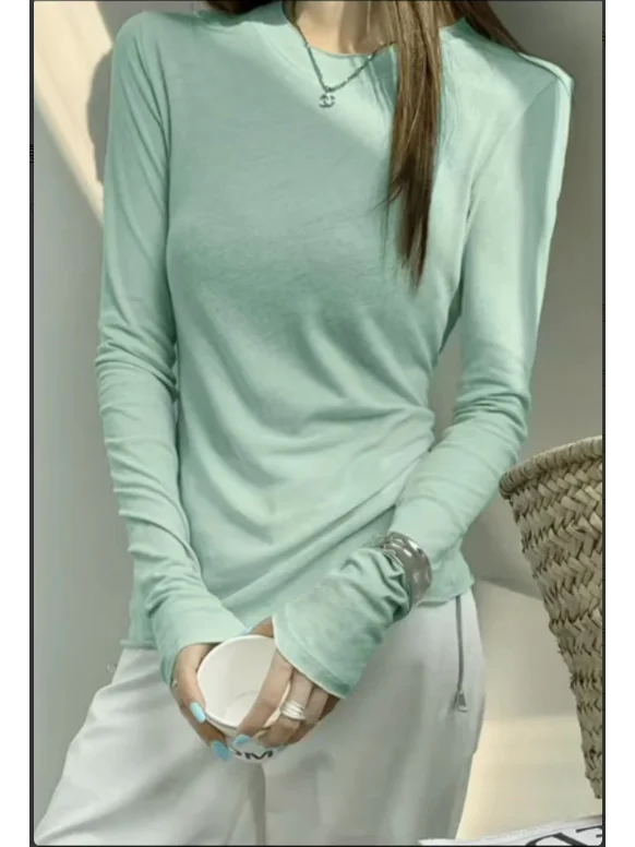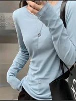 Slim Fit Long Sve round Ne Base irt Women's Blue T-irt Spring Autumn Thin Cotton Pure Color Casual Top Ins Sle