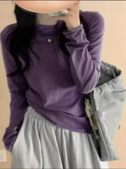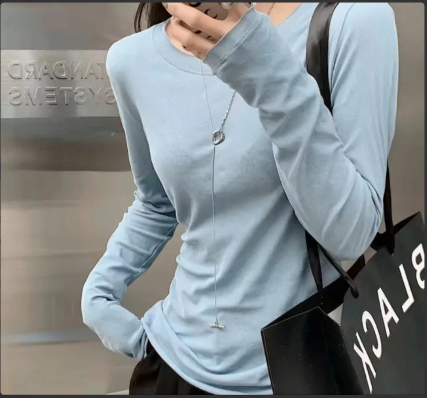 Slim Fit Long Sve round Ne Base irt Women’s Blue T-irt Spring Autumn Thin Cotton Pure Color Casual