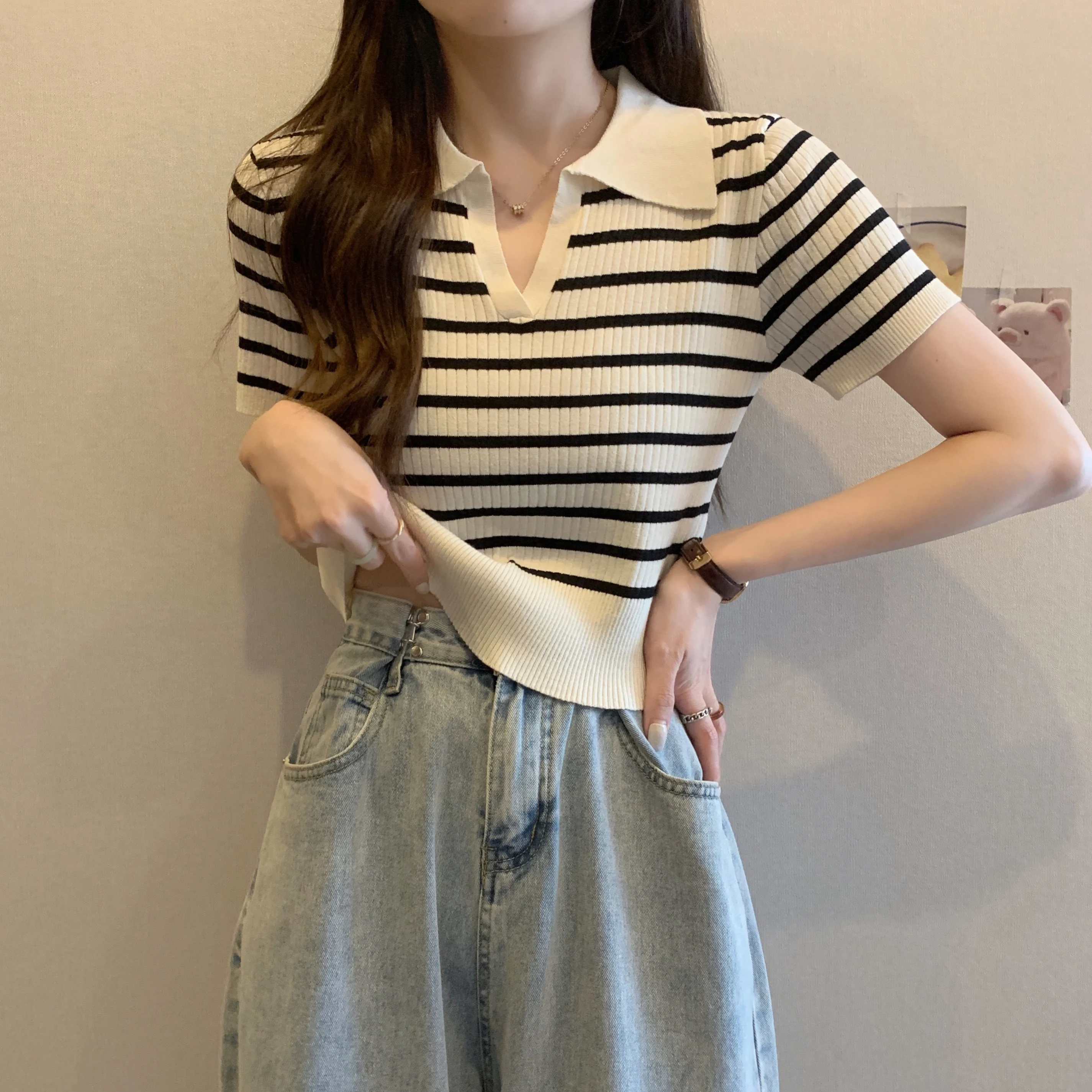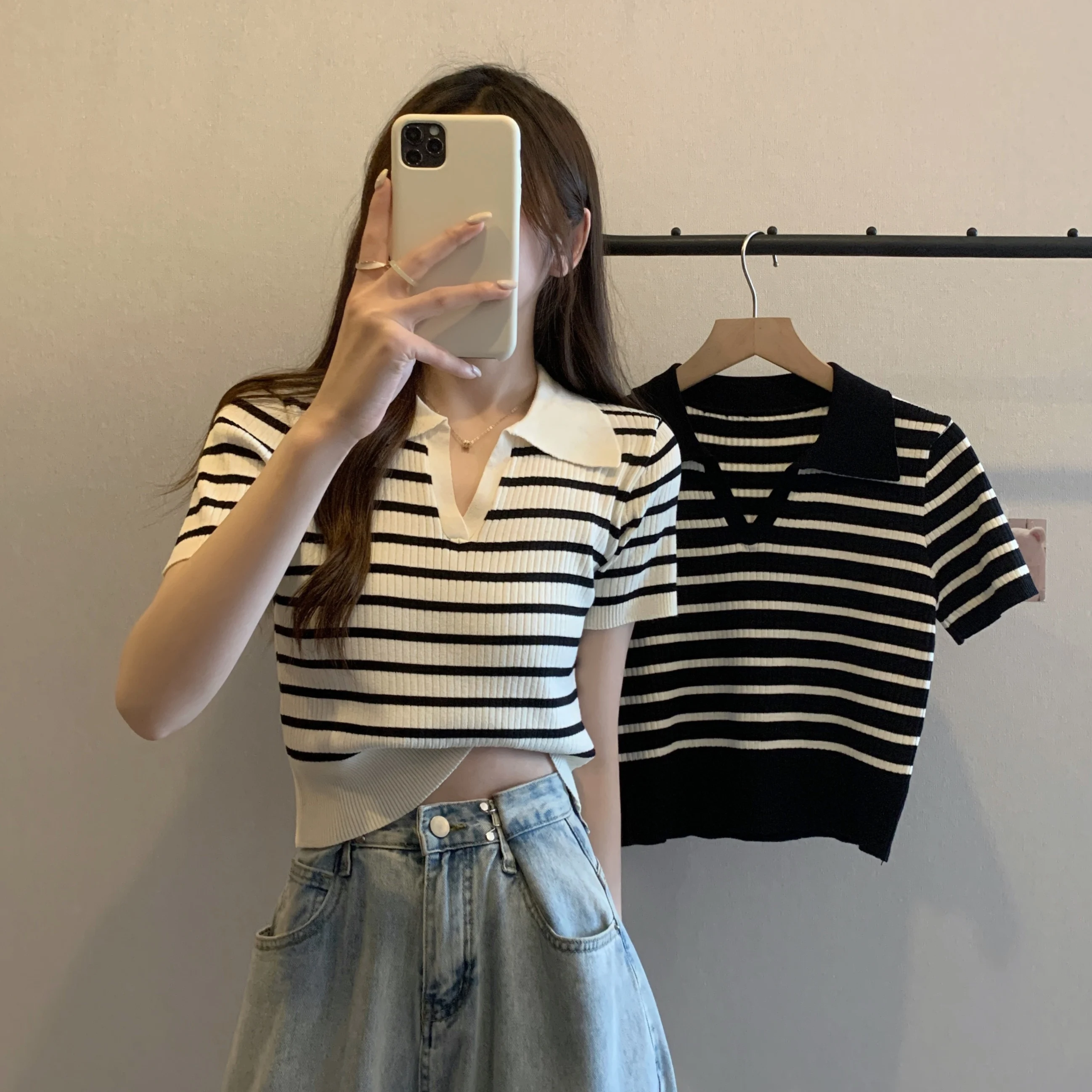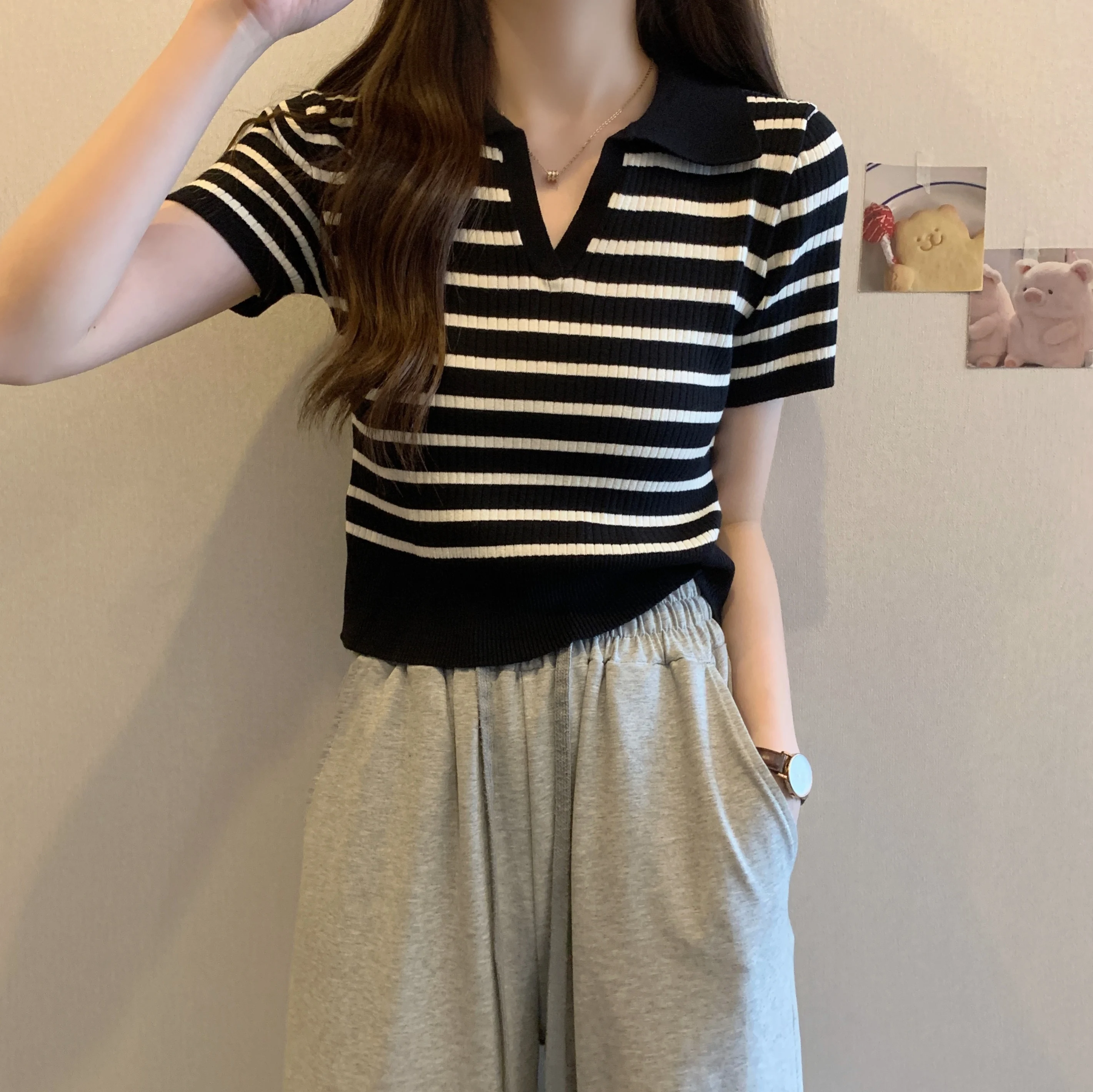 Perfect for summer, this V-neck striped short-sleeved knitwear offers a lightweight and breathable design, keeping you cool during hot days.