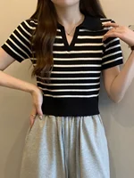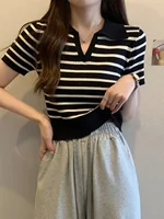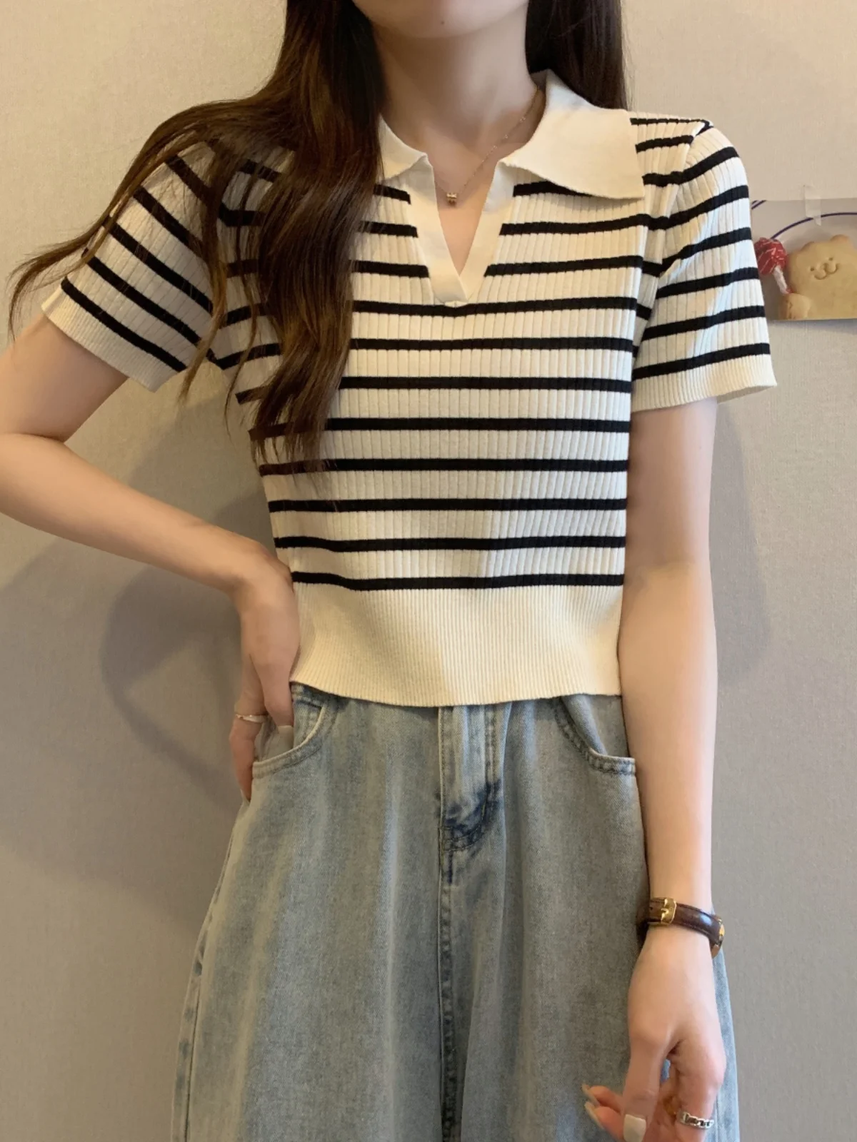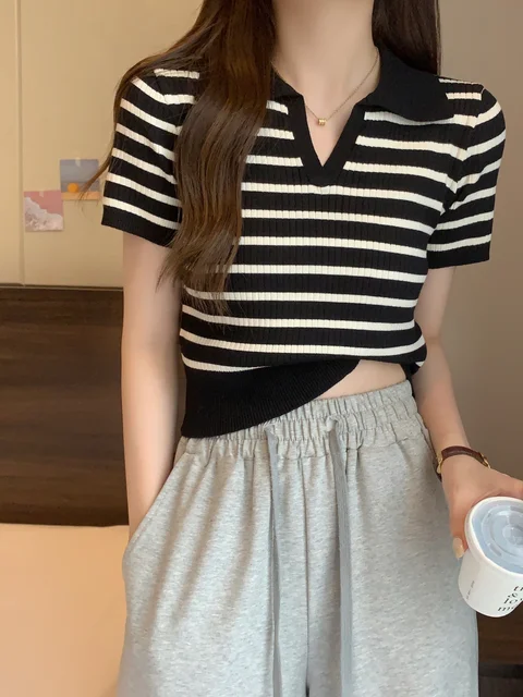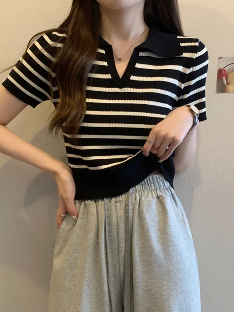Perfect for summer, this V-neck striped short-sleeved knitwear offers a lightweight and breathable design, keeping you cool during hot days.