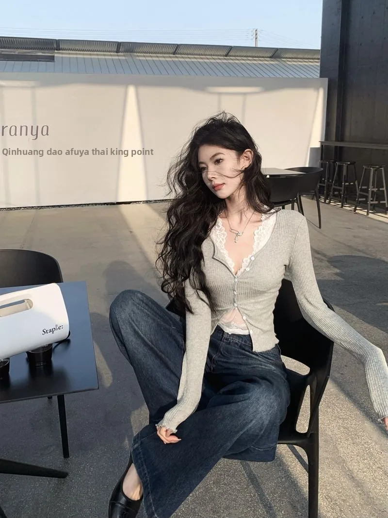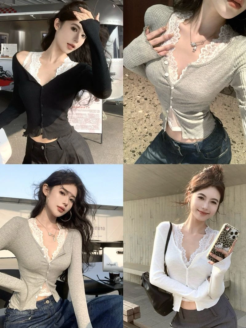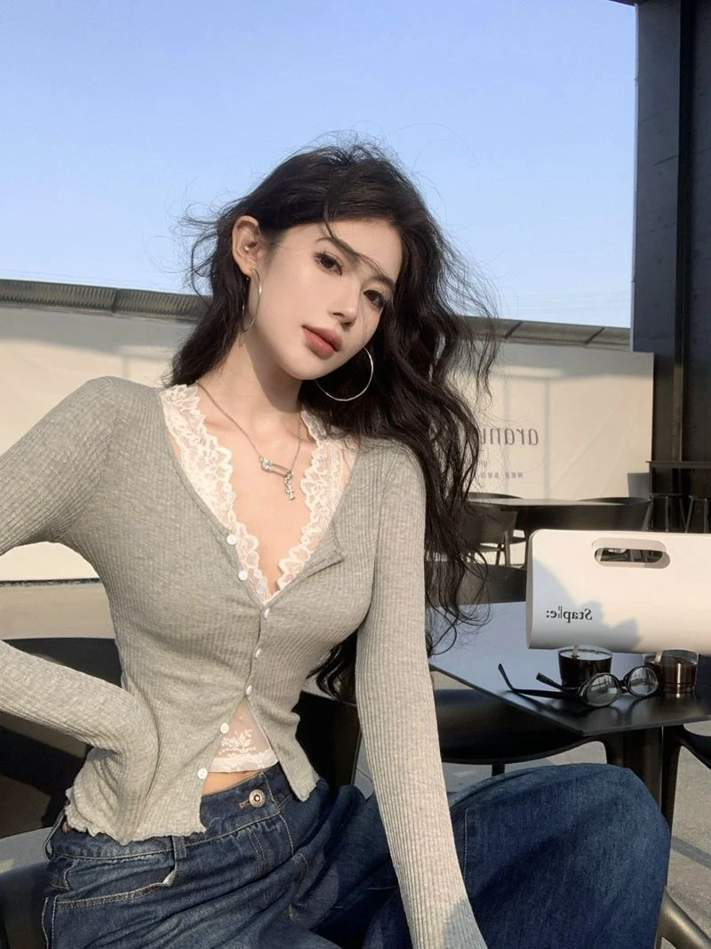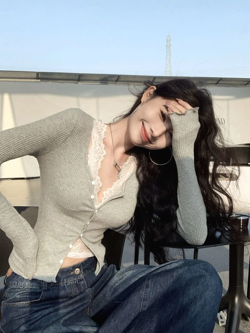 Slim Fit V-Ne Long Sve Knitted Open Cardigan ort Sle Casual Wear ey Color Blo Layering Women's T-irt for Autumn