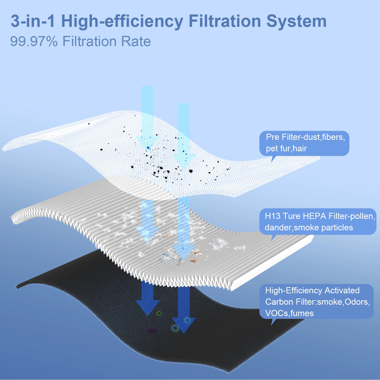 🧽【𝗛𝗶𝗴𝗵-𝗘𝗳𝗳𝗶𝗰𝗶𝗲𝗻𝗰𝘆 𝗙𝗶𝗹𝘁𝗿𝗮𝘁𝗶𝗼𝗻】This home air purifier features a True H13 HEPA filter with a 3-stage high-efficiency filtration system: pre-filter, True HEPA filter, and activated carbon filter. It effectively captures airborne particles as small as 0.3 microns, including pet hair, dander, pollen, dust, odors, and wildfire smoke. With this HEPA air purifier, you can say goodbye to breathing difficulties, coughing, and insomnia caused by air pollution. Breathe cleaner, healthier air and enjoy a better quality of life