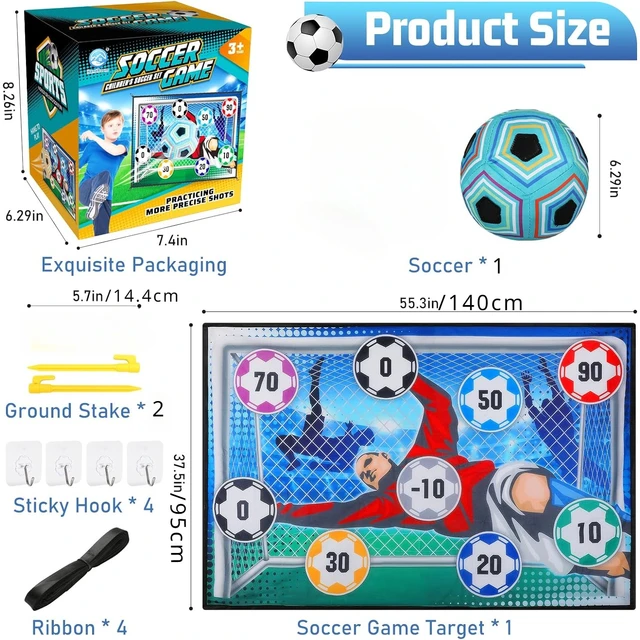 âš½Best Football Game Set – The football game set contains everything you need. This football toy set includes packaging box, flannel goal, soft football with Velcro (random colors), ground stakes, sticky hooks, and ribbons to create a mini court anywhere. It is the perfect football toy for practicing skills or playing with friends.
