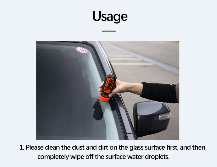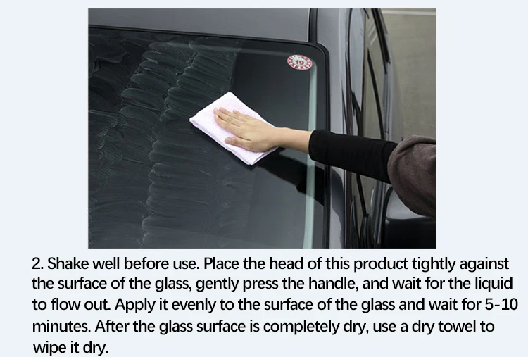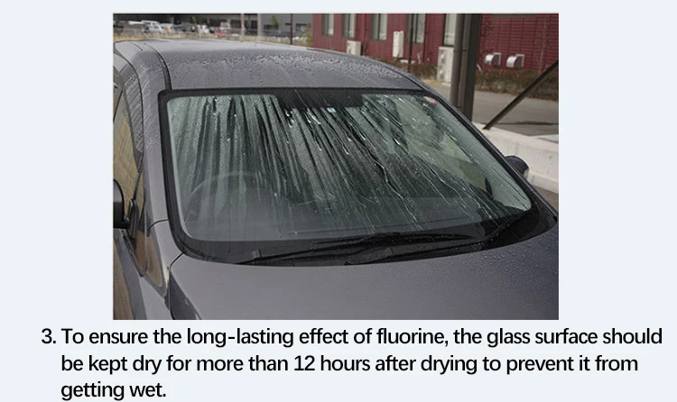 3. After drying for 5-10 minutes, wipe it off with a dry, clean towel,   afterward dry for more than 12 hours, in order to make the coating adhere   firmly to the windshield.