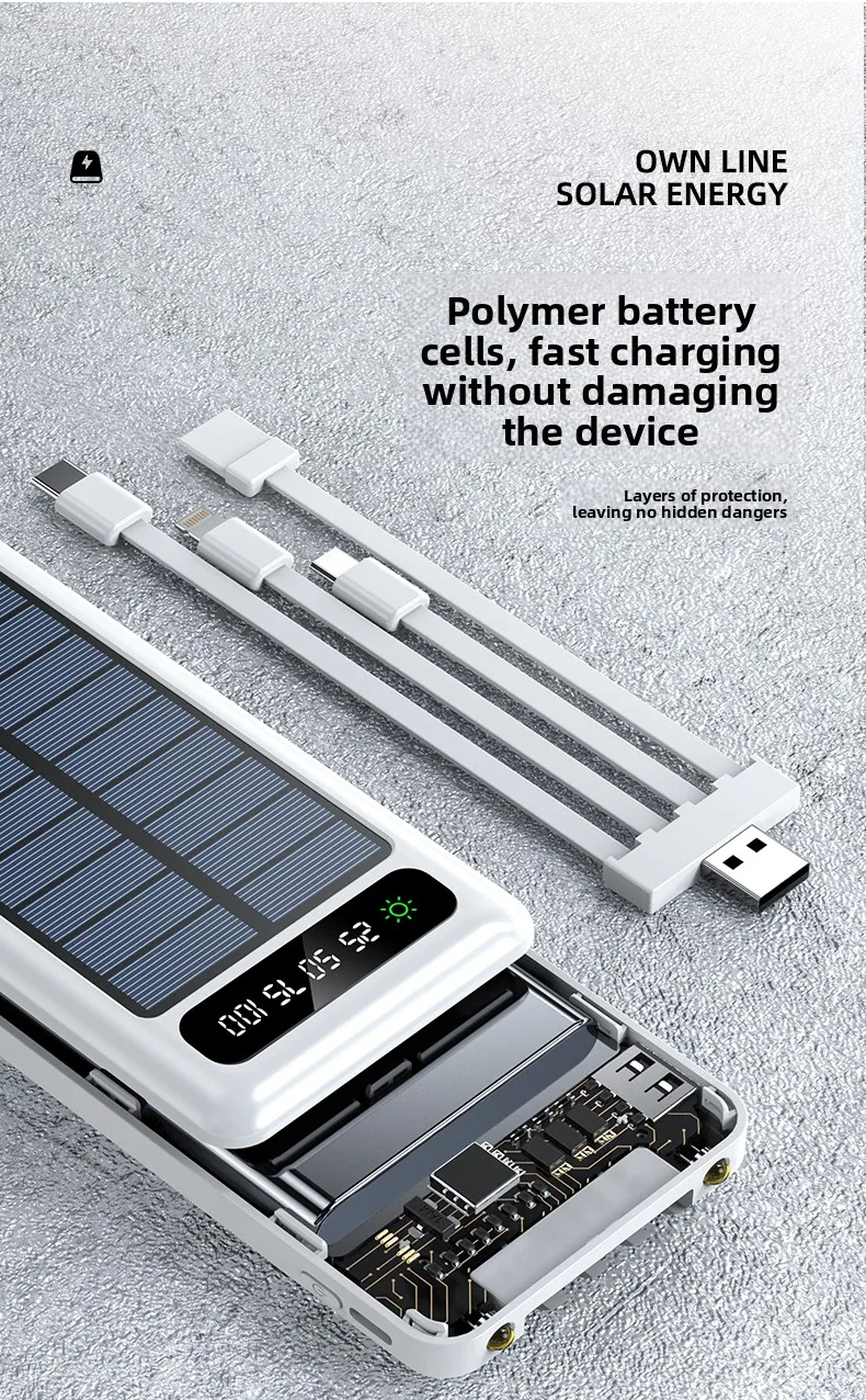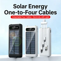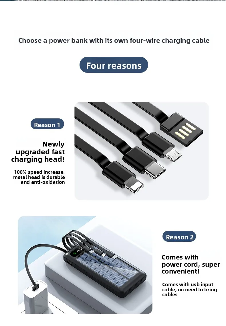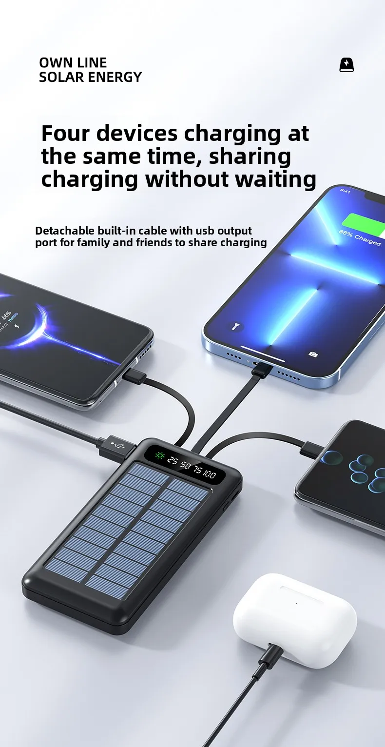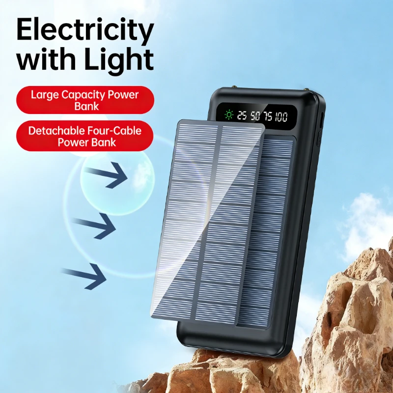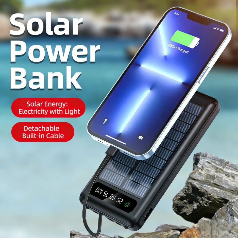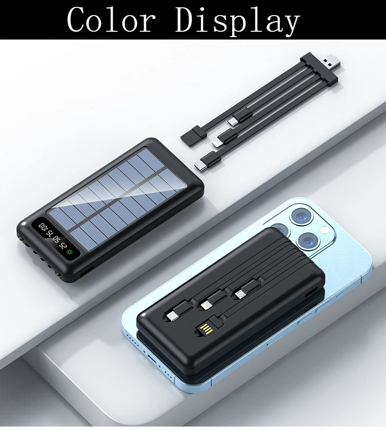 Solar Power Bank 20000mAh Fast Charging Dual USB 4 Cables LED Display Portable Charger Compatible with iPhone Android All Device
