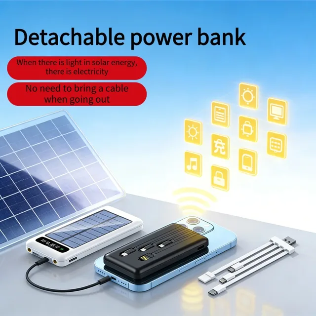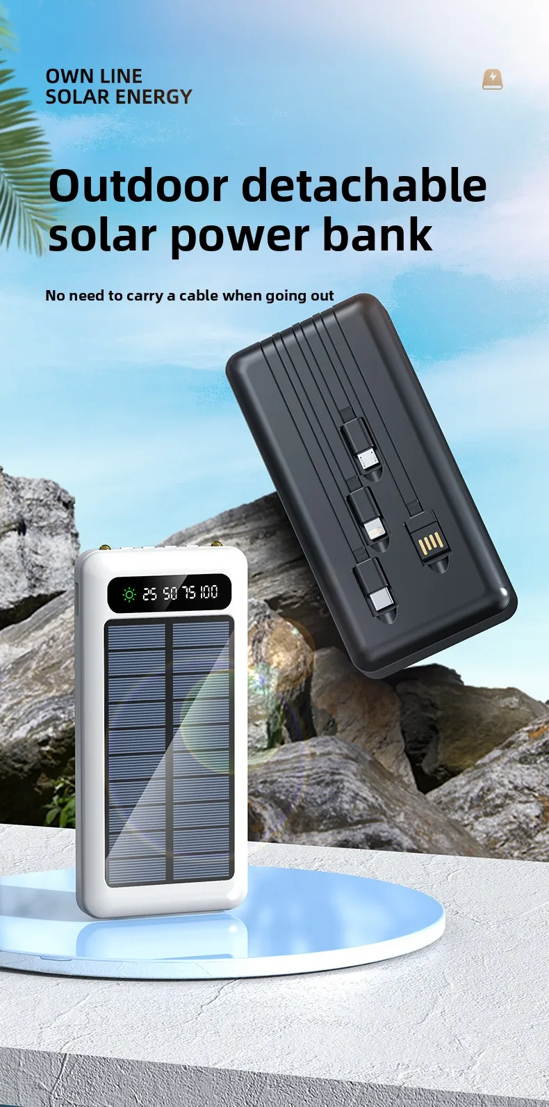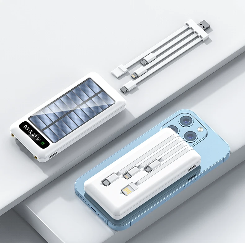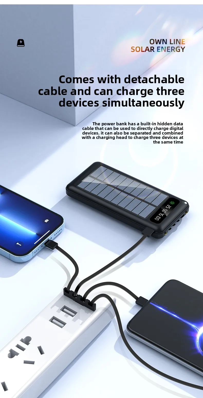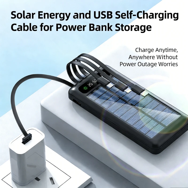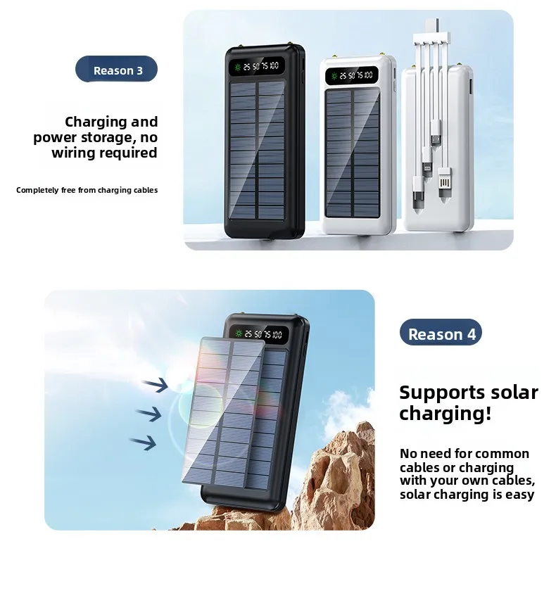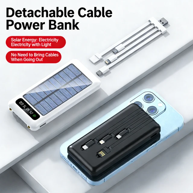 Solar Power Bank 20000mAh Fast Charging Dual USB 4 Cables LED Display Portable Charger Compatible with iPhone Android All Device