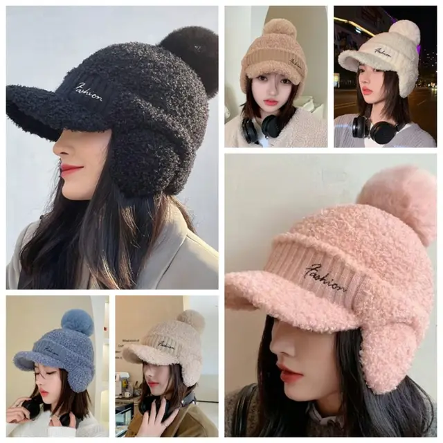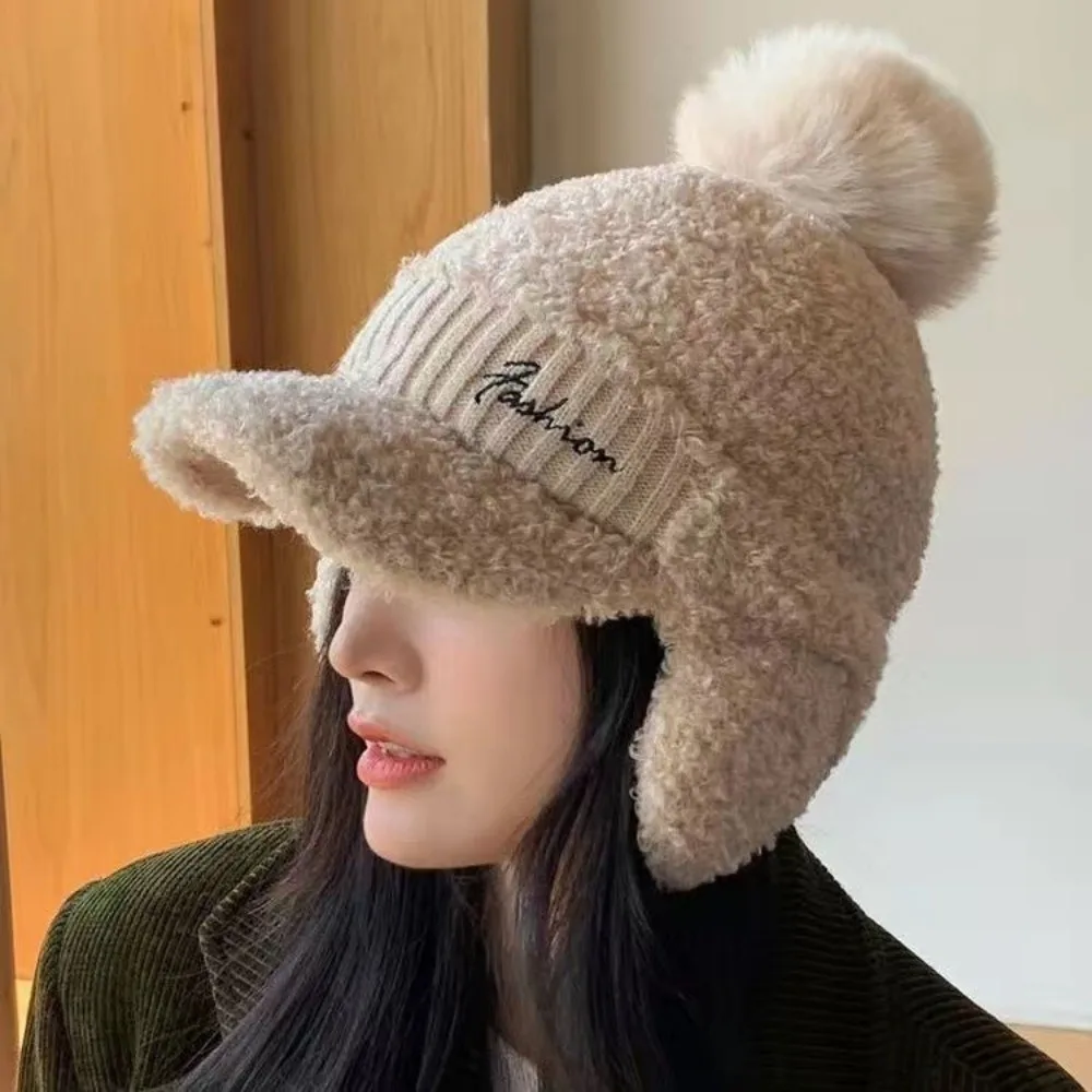 Solid Color Warm Earmuffs Cap Windproof Thermal Pompom Plush Beanie Thick Versatile Ear Flap Protection Hat Outdoor Activities