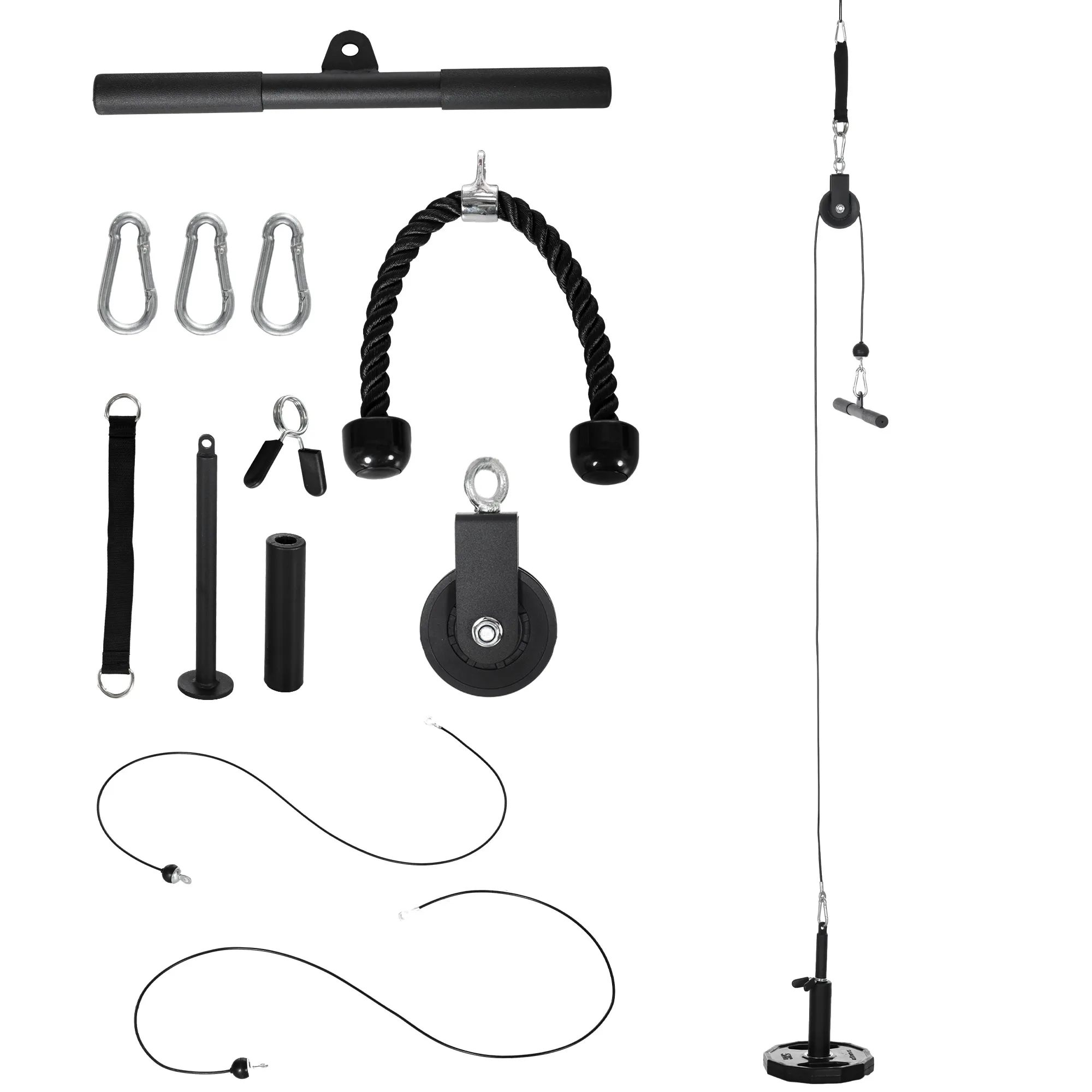 ● This set comes with a steel pulley, two pull ropes, a handle strap, a handle bar and a loading pin