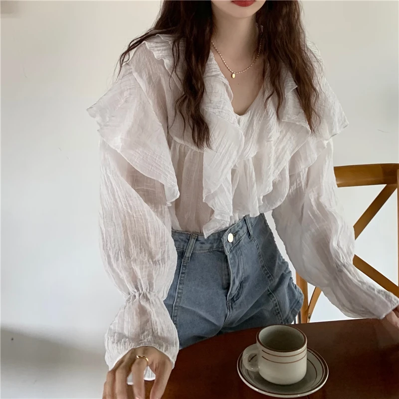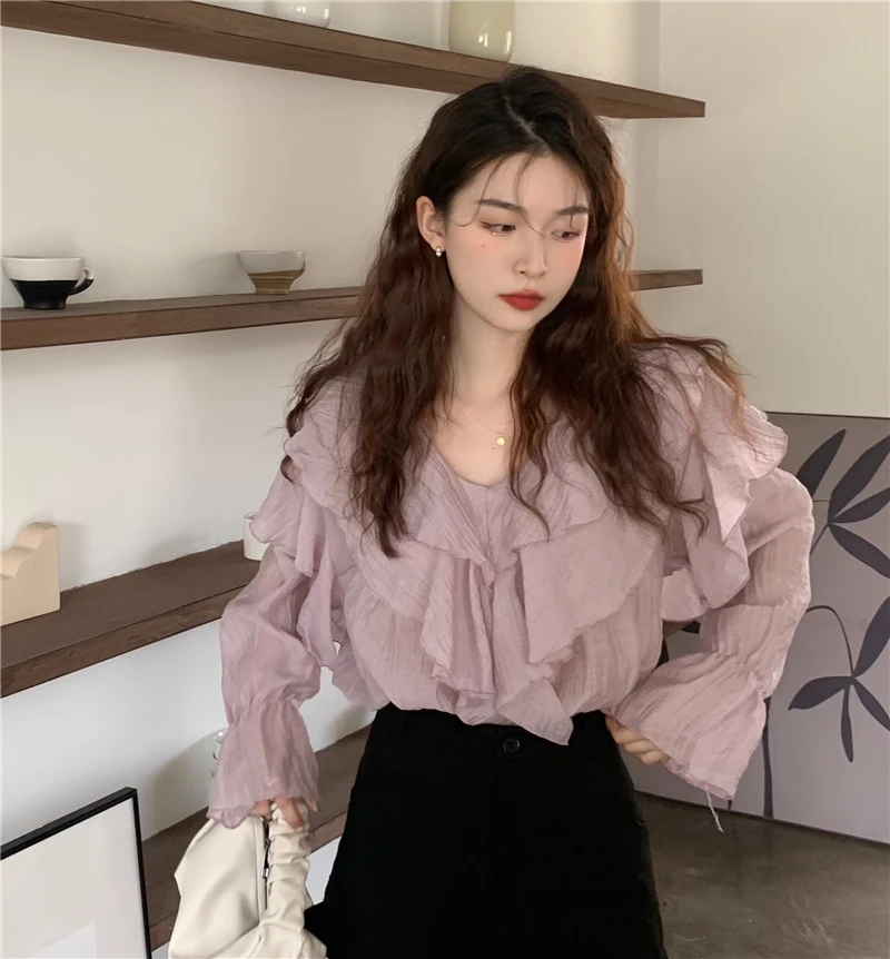 Made from lace material, this shirt offers a delicate and feminine touch, ideal for spring wear.