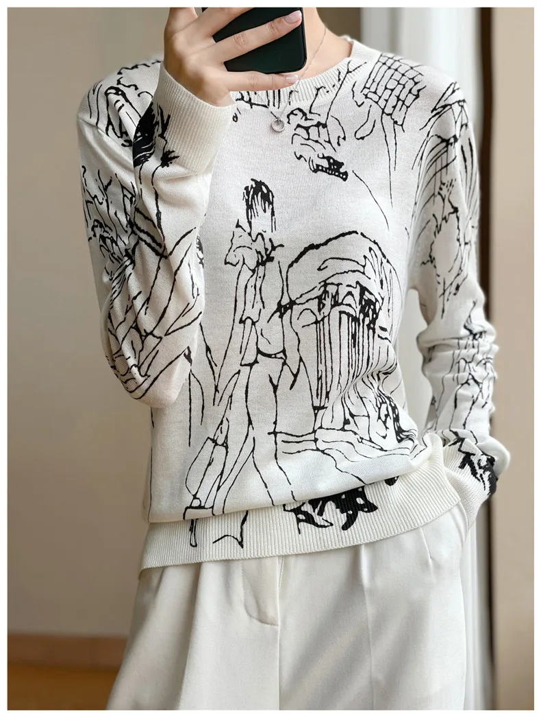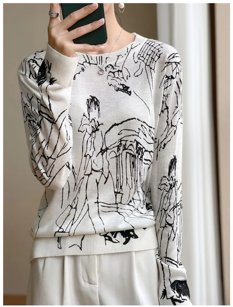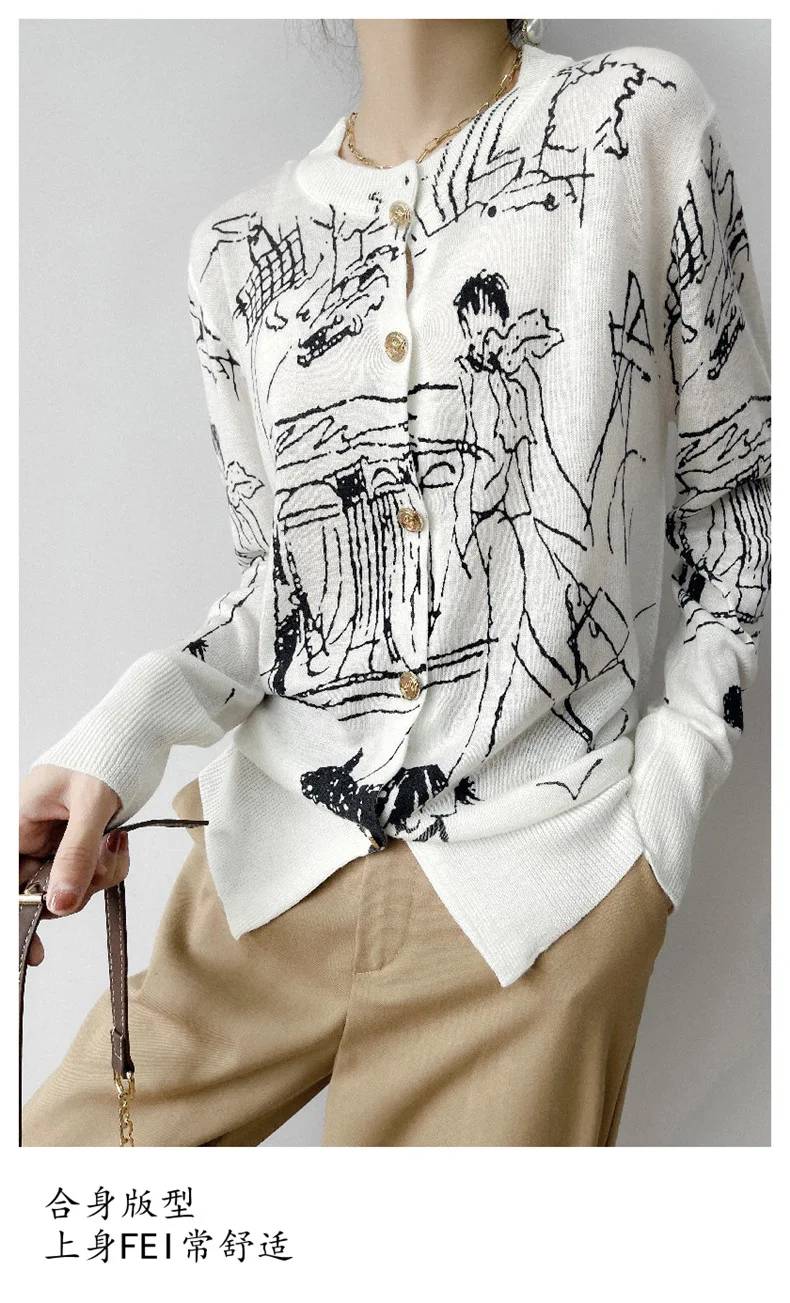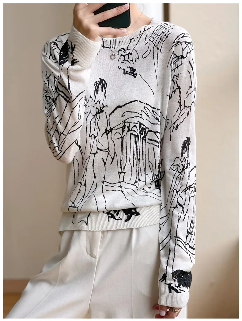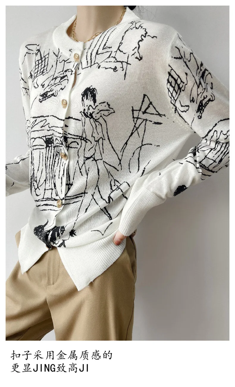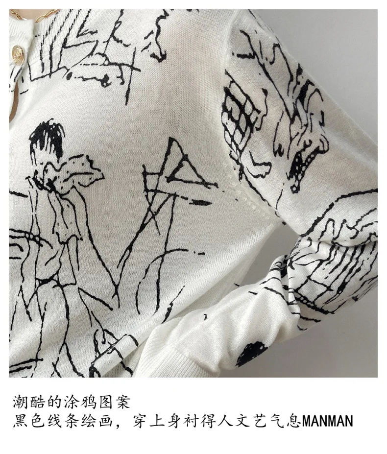 Spring And Autumn New Wool Knitted Cardigan Female Graffiti Print Loose Pullover Long Sleeve Round Neck