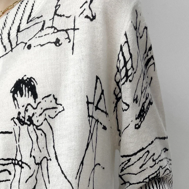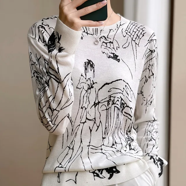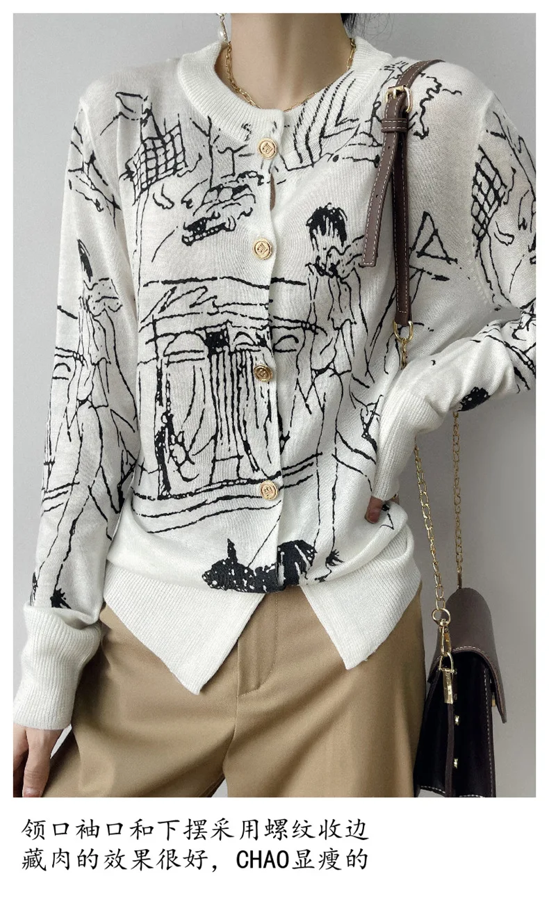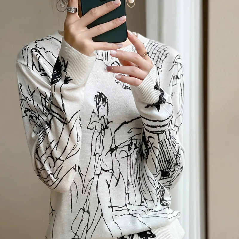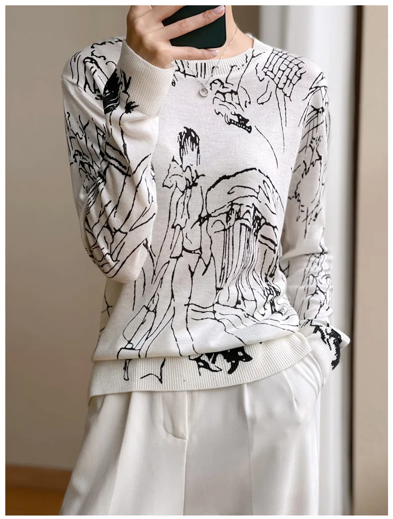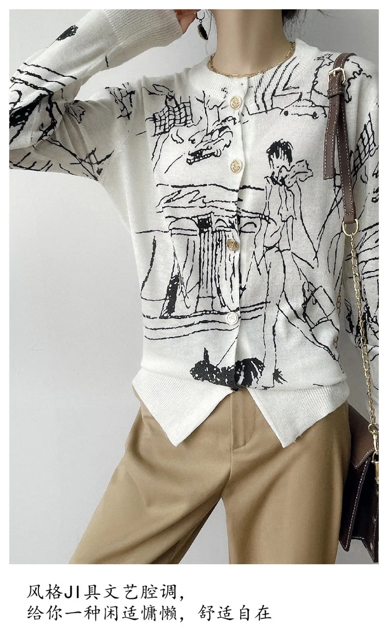 Spring And Autumn New Wool Knitted Cardigan Female Graffiti Print Loose Pullover Long Sleeve Round Neck