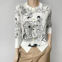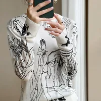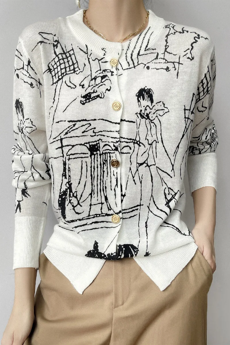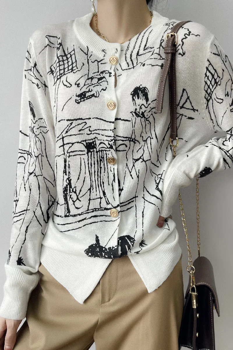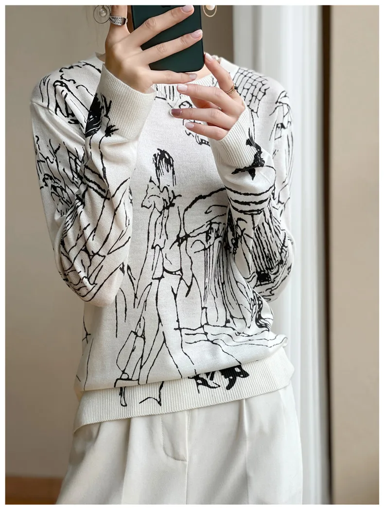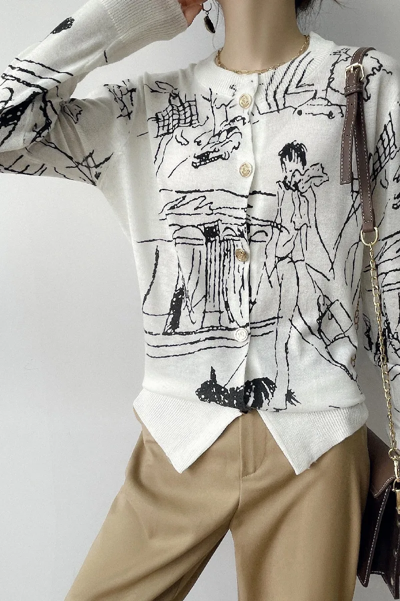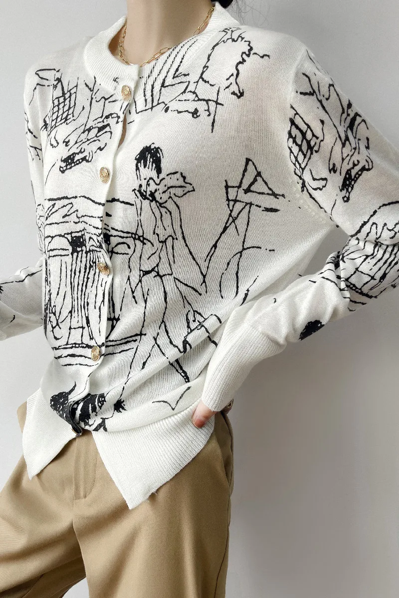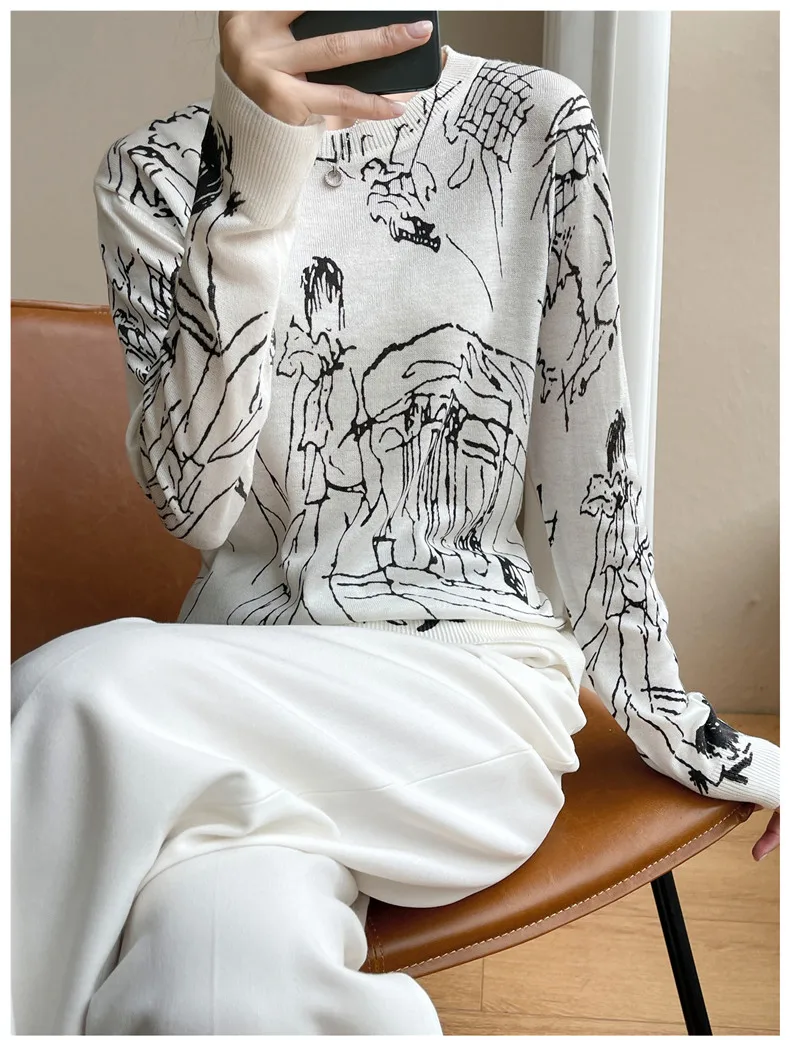 Spring And Autumn New Wool Knitted Cardigan Female Graffiti Print Loose Pullover Long Sleeve Round Neck