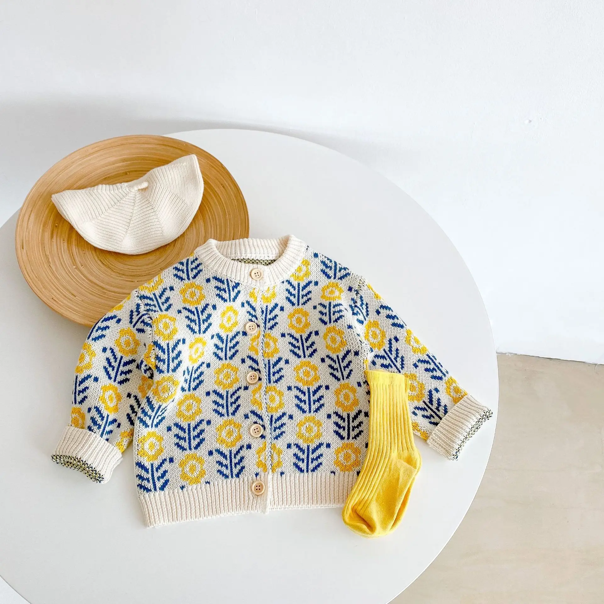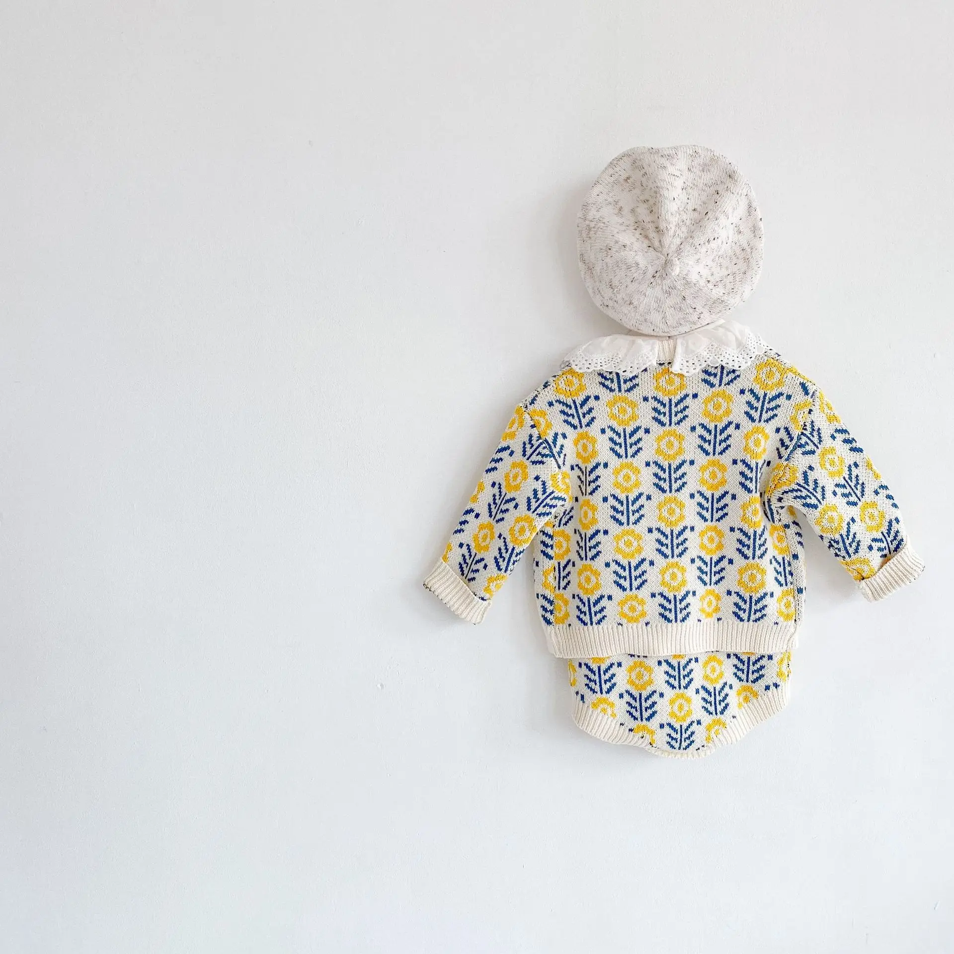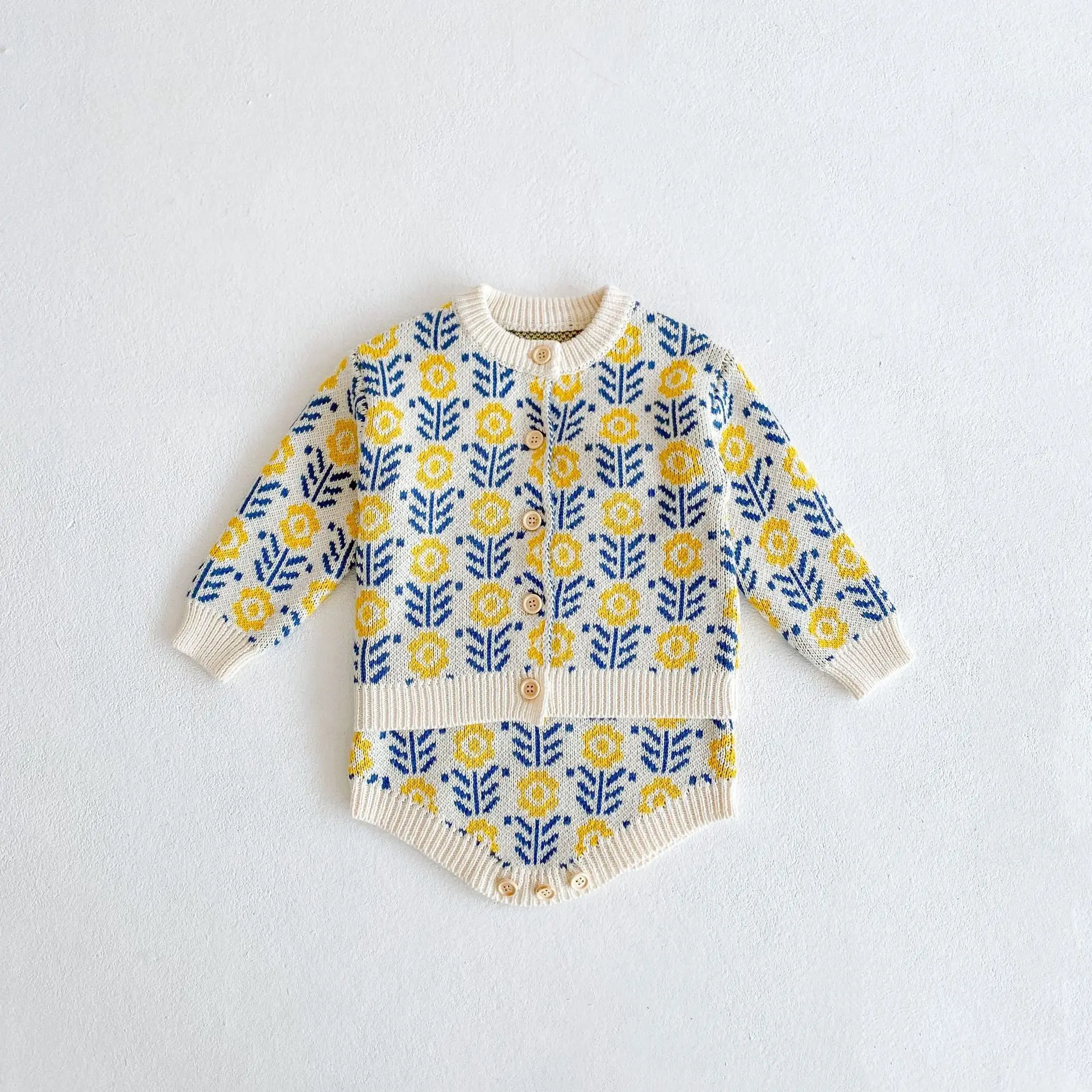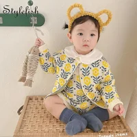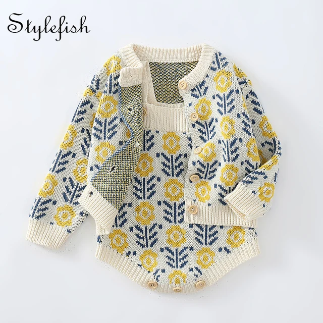 Spring baby suit clothes, baby sweater with flowers, girls’ knitted cardigan+jumpsuit crawling