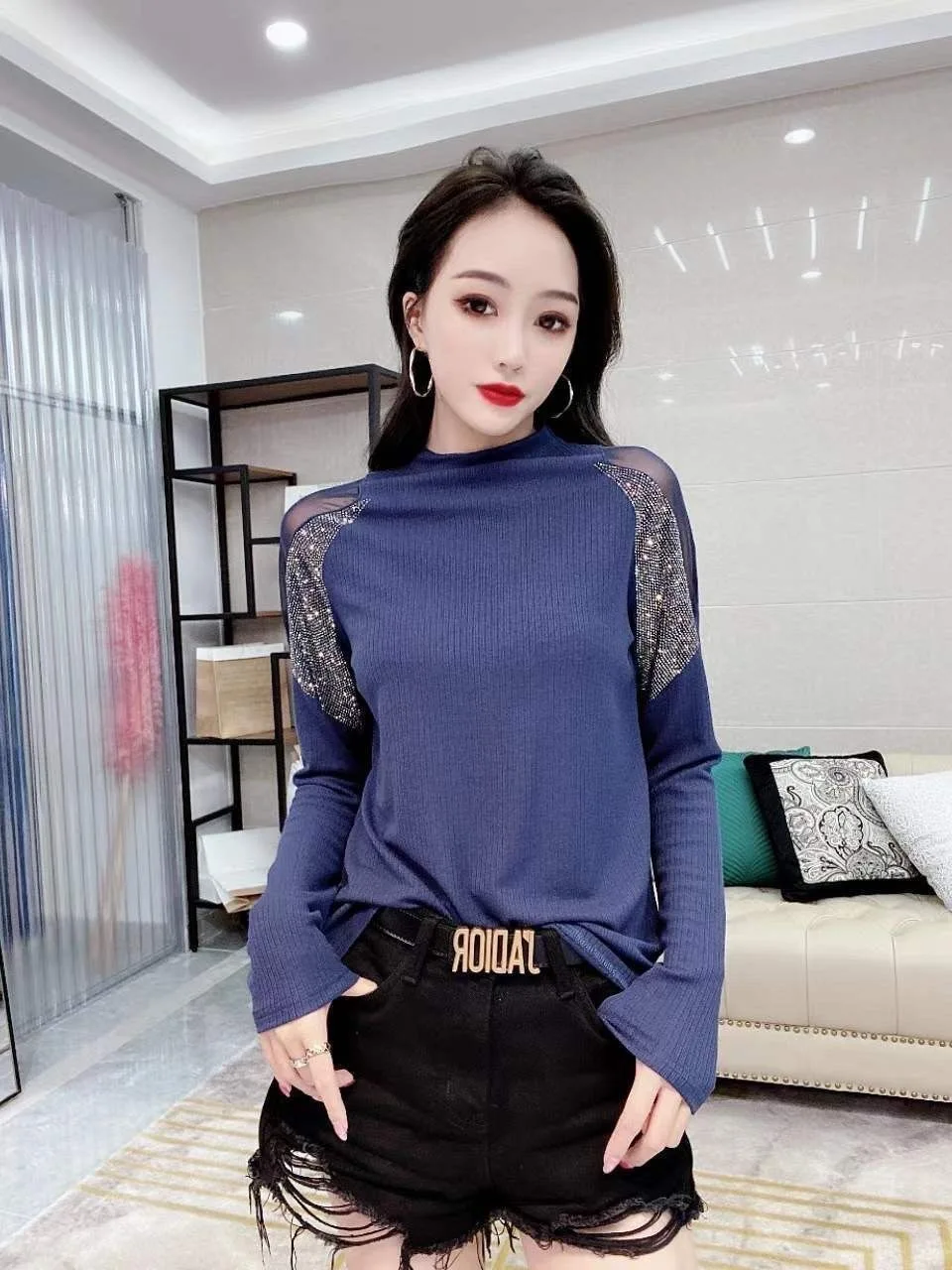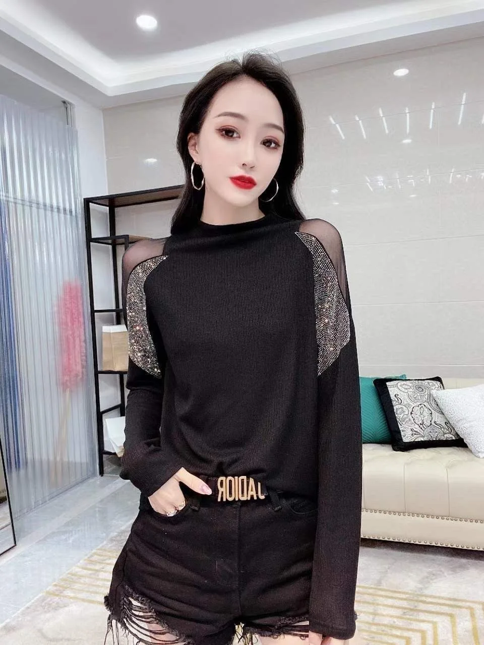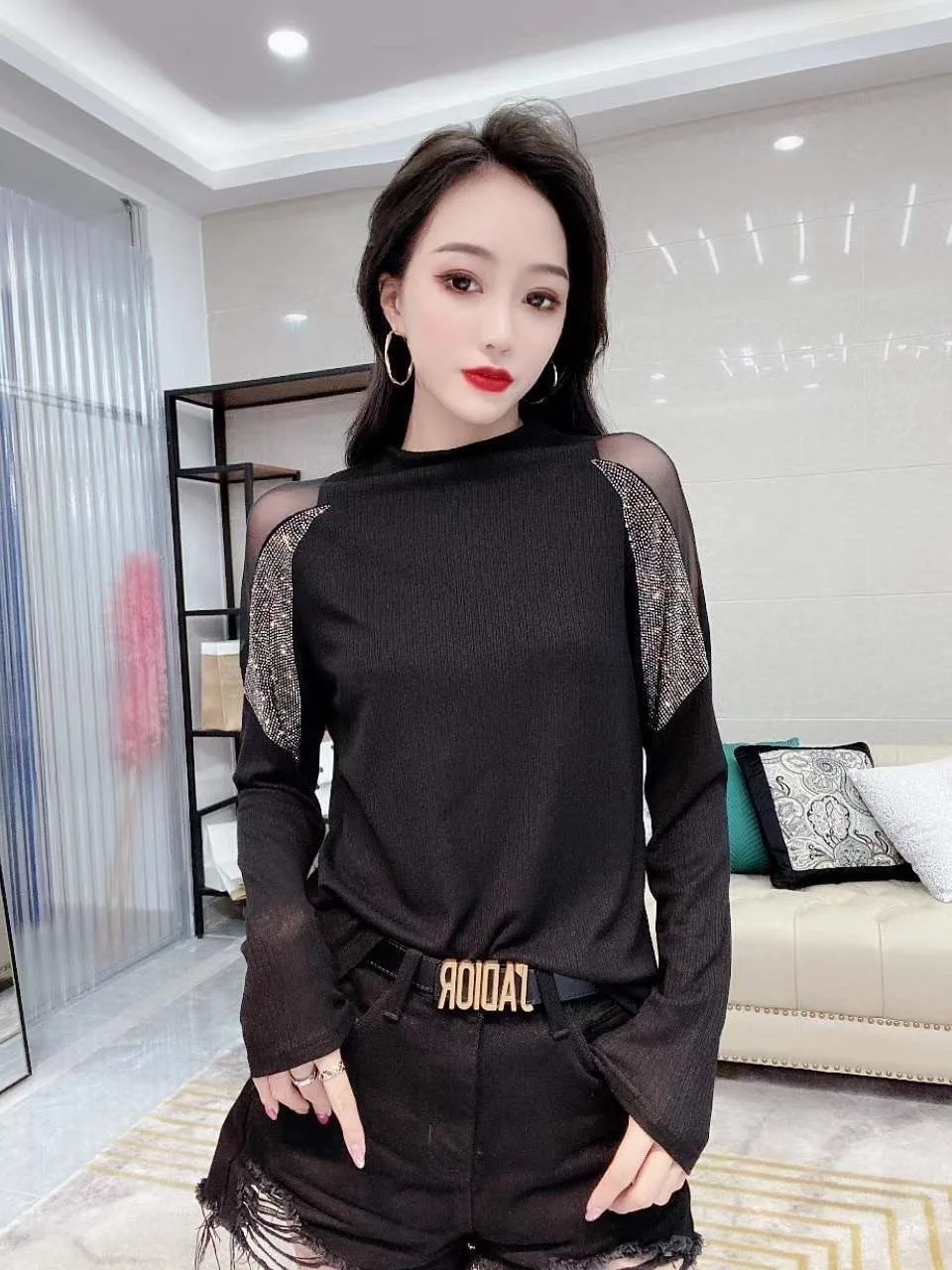 This T-shirt features a European style design, offering a fashionable and trendy look for the modern woman.