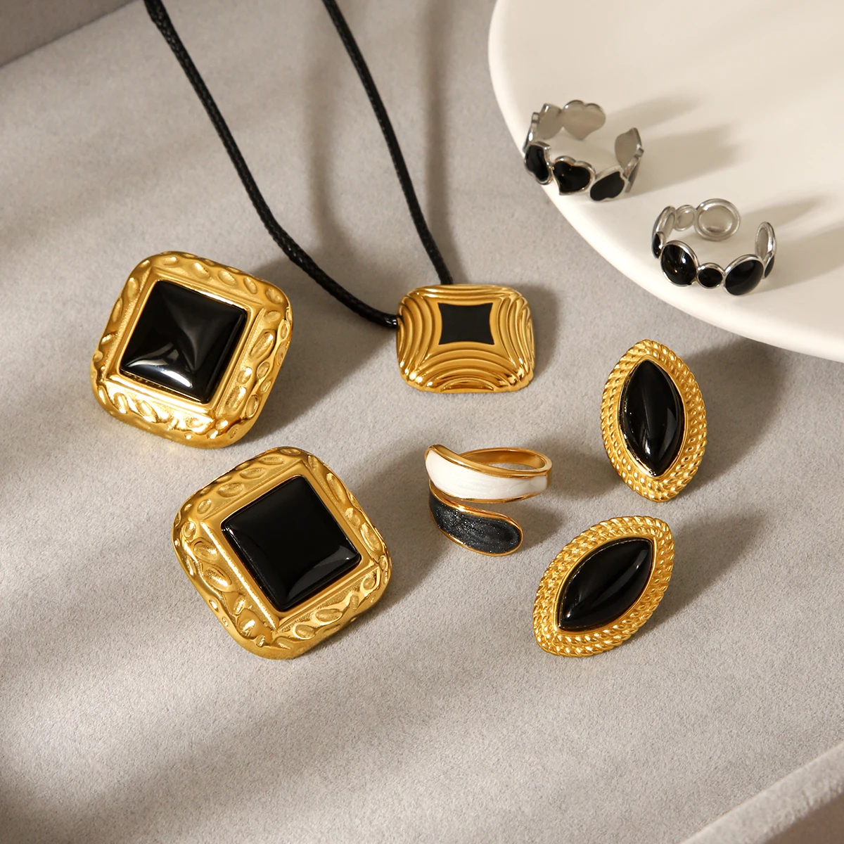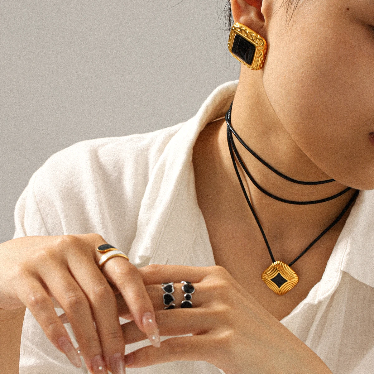 Noir Studs Earrings fuse vintage glamour with modern attitude. Featuring a jet-black geometric stone framed in textured gold-plated stainless steel, these chunky studs demand attention. they’re the perfect finishing touch for nights out, power moves, or whenever you feel unstoppable.