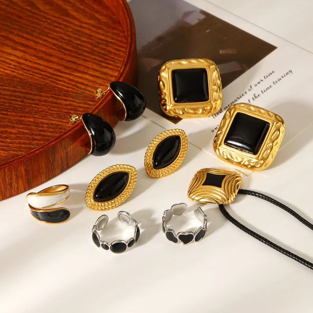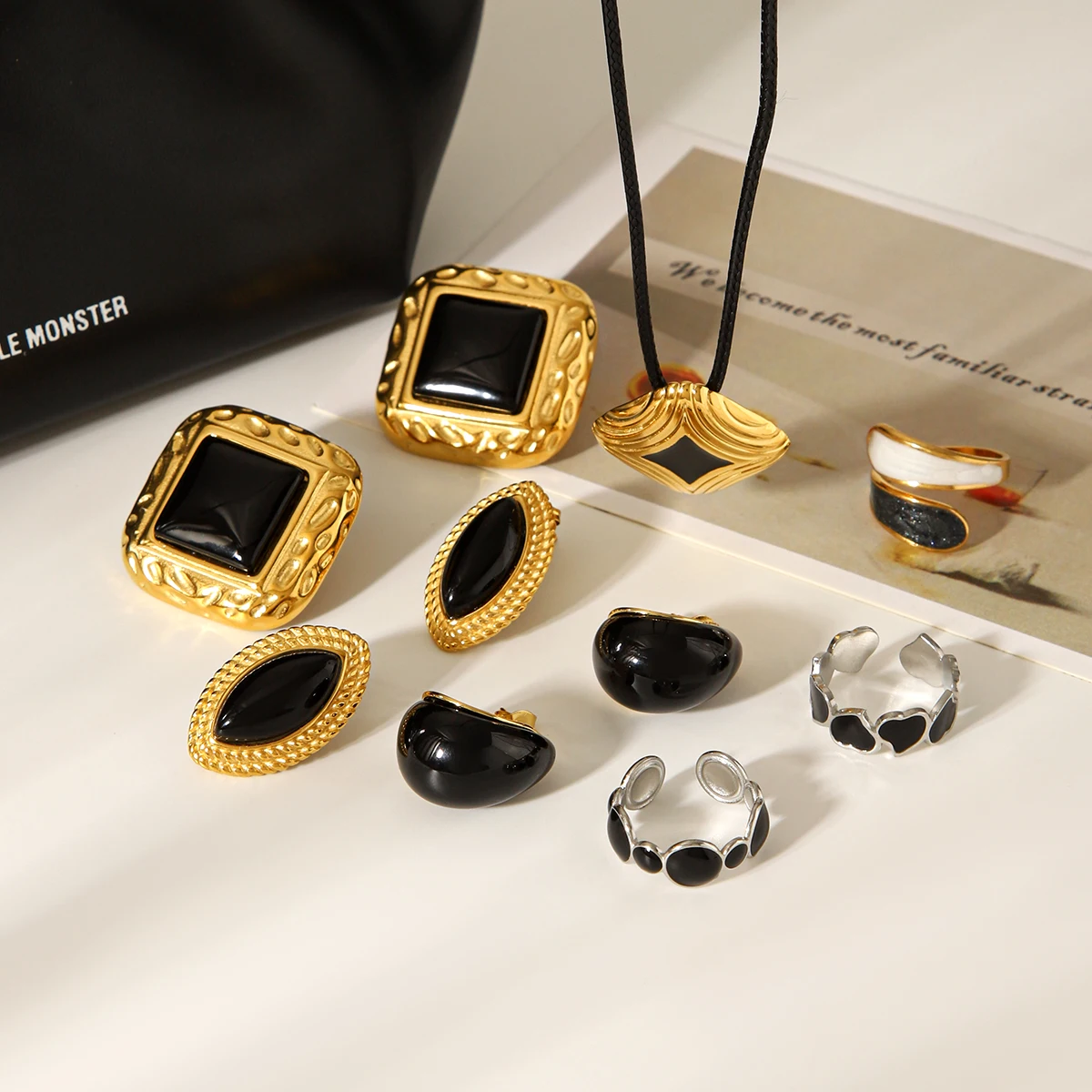 Noir Studs Earrings fuse vintage glamour with modern attitude. Featuring a jet-black geometric stone framed in textured gold-plated stainless steel, these chunky studs demand attention. they’re the perfect finishing touch for nights out, power moves, or whenever you feel unstoppable.