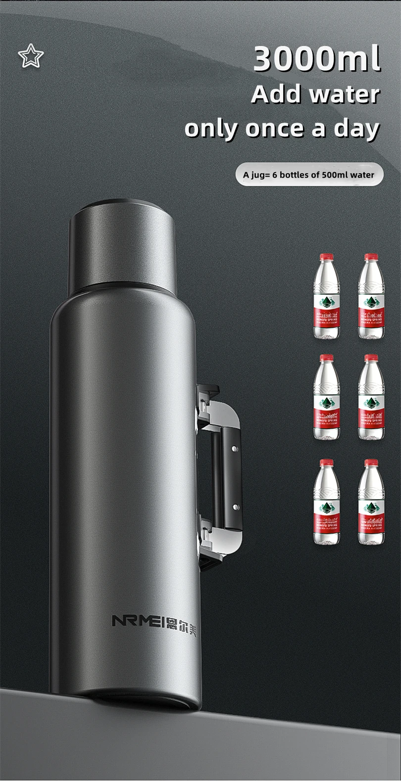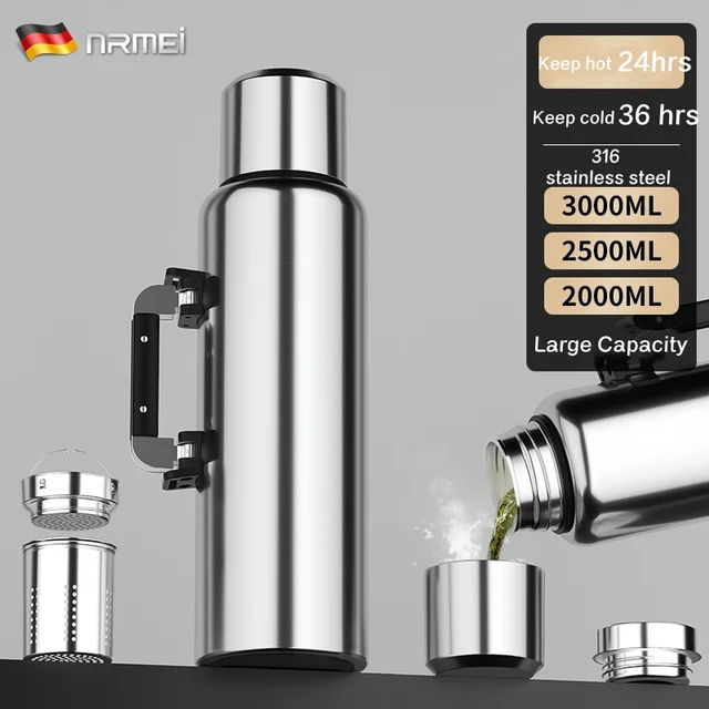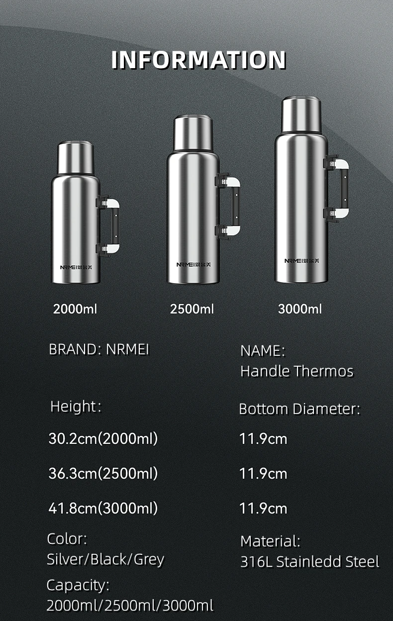 Stainless Steel Water Bottle, Portable Sports Bottle, BPA Free, Large Capacity, Bottle Bag and Handle, 2L, 3L