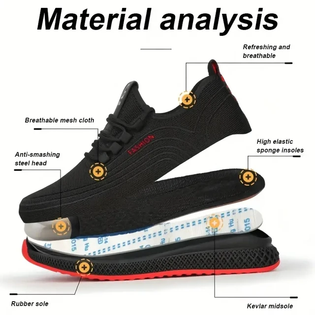 Super light safety shoe:It is like the weight of a pair of running shoes. They can help you to work happily all day without exhausting your feet. With super soft insoles and High elastic sole, your feet are safe and comfortable. Flying knit upper is very soft, Keep your feet comfortable and breathable.