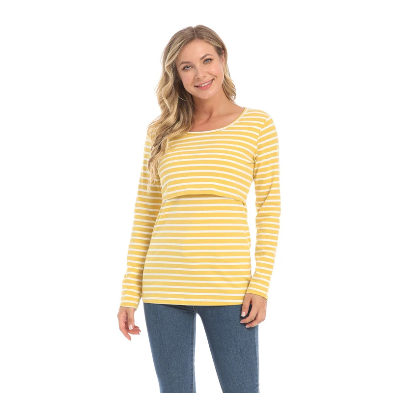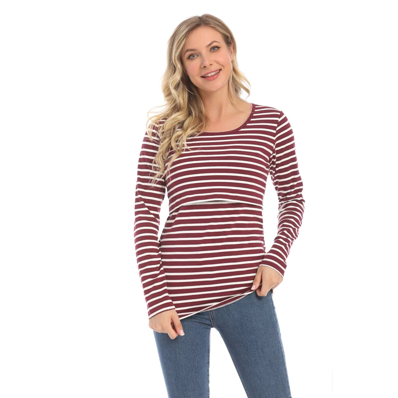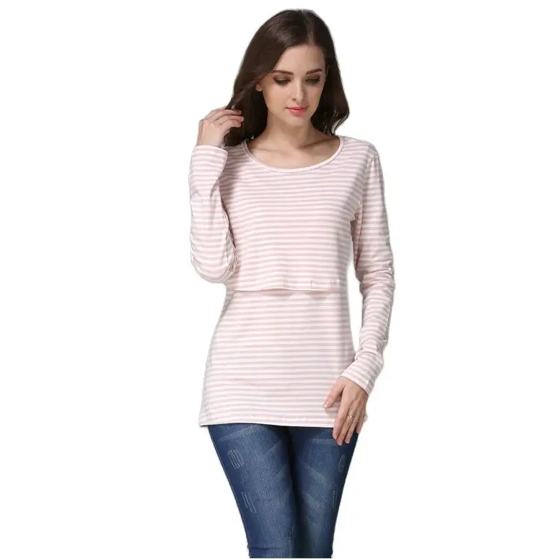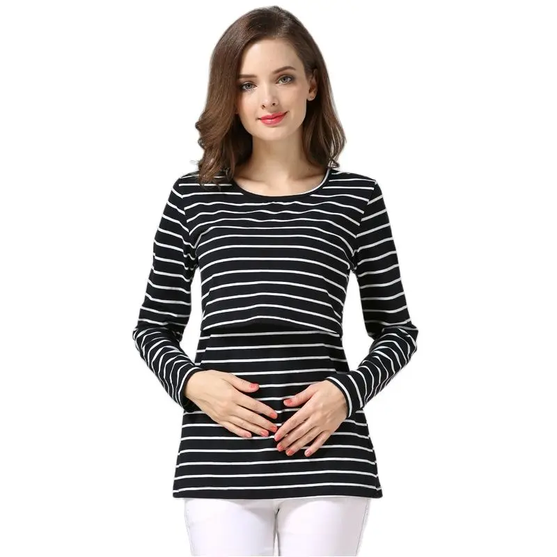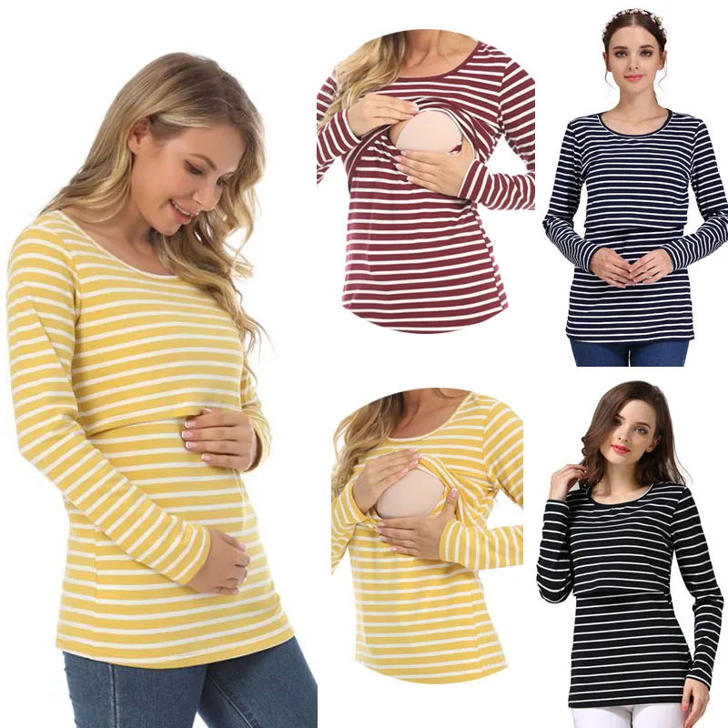 Striped Maternity T-shirts Long Sleeve Nursing Breastfeeding Clothes For Pregnant Women Cotton Postpartum