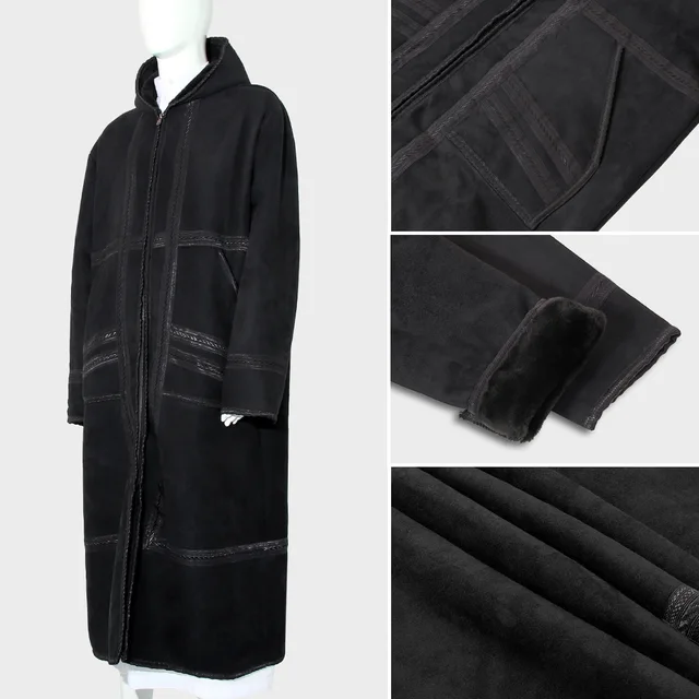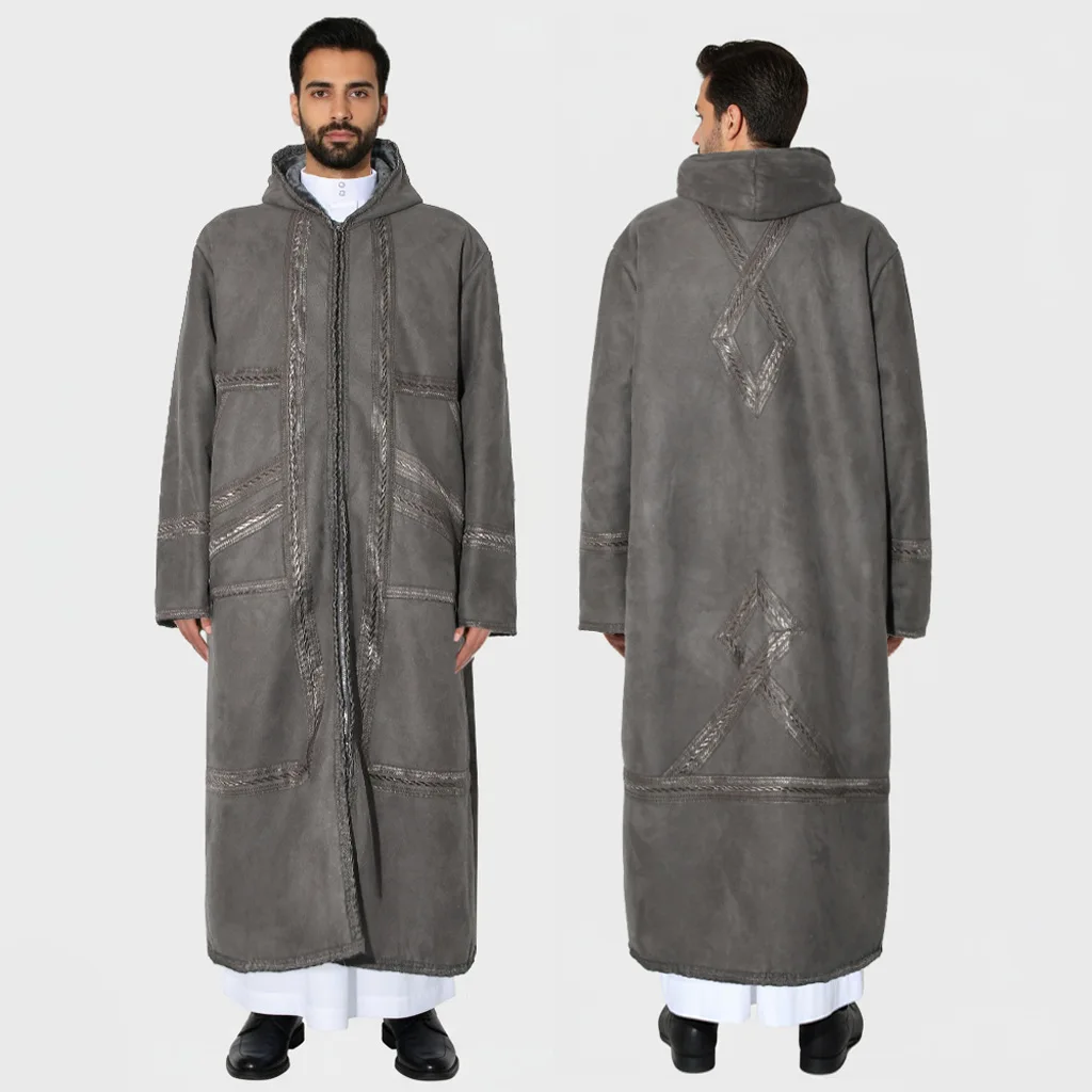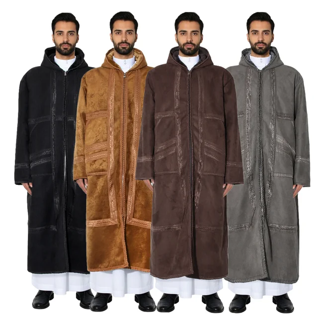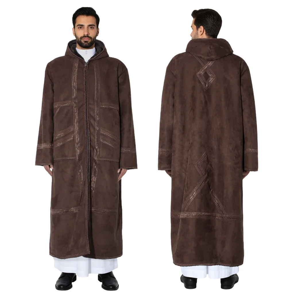 Suede Velvet Abaya Muslim Men’s Prayer Robe Thickened Coat Warm Hooded Cardigan Eid Djellaba Islam